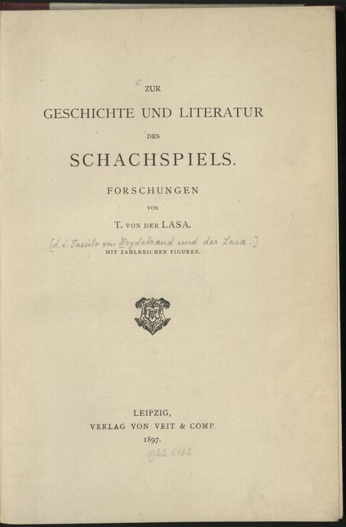 Zur Geschichte und Literatur des Schachspiels : Forschungen / von T. von der Lasa