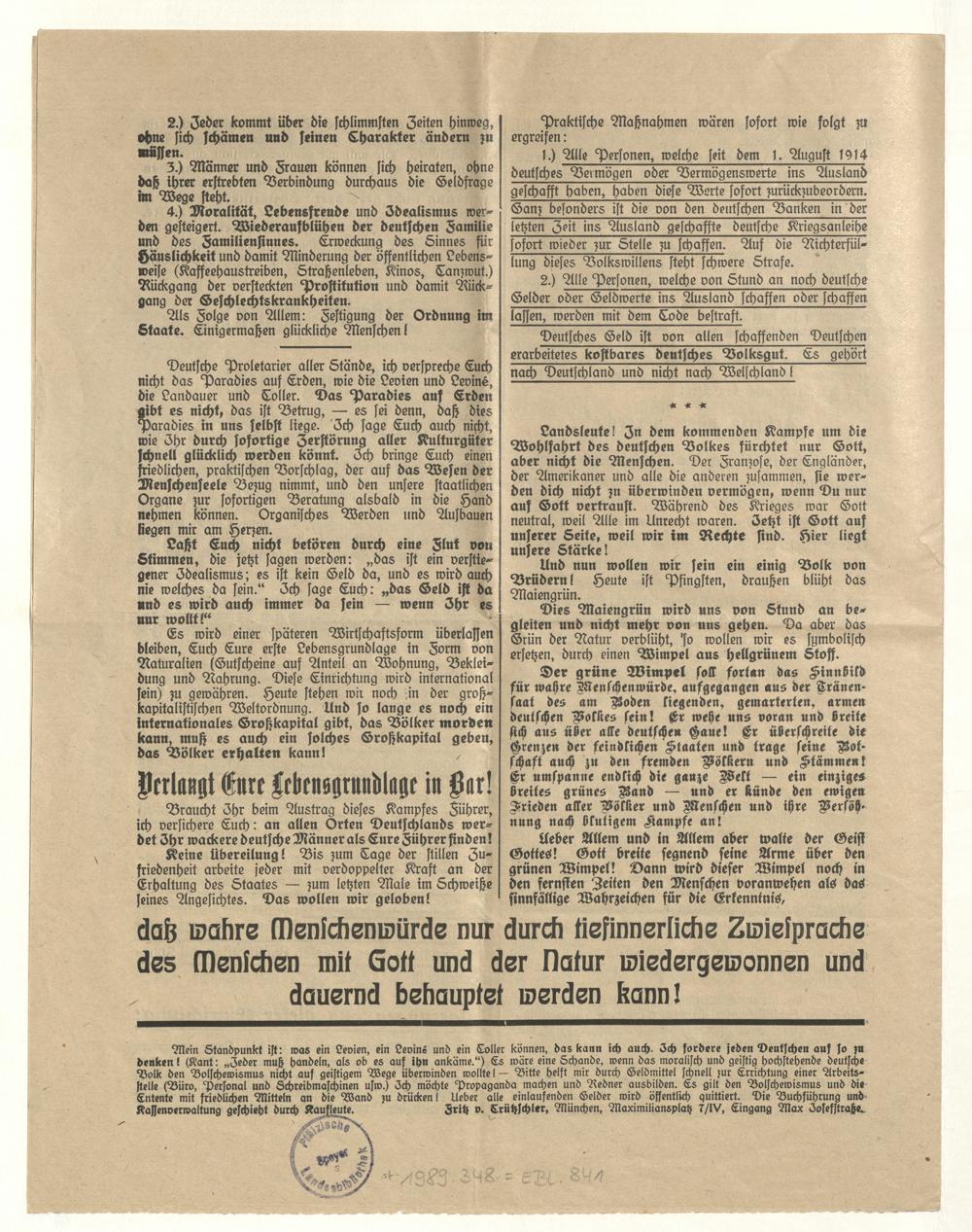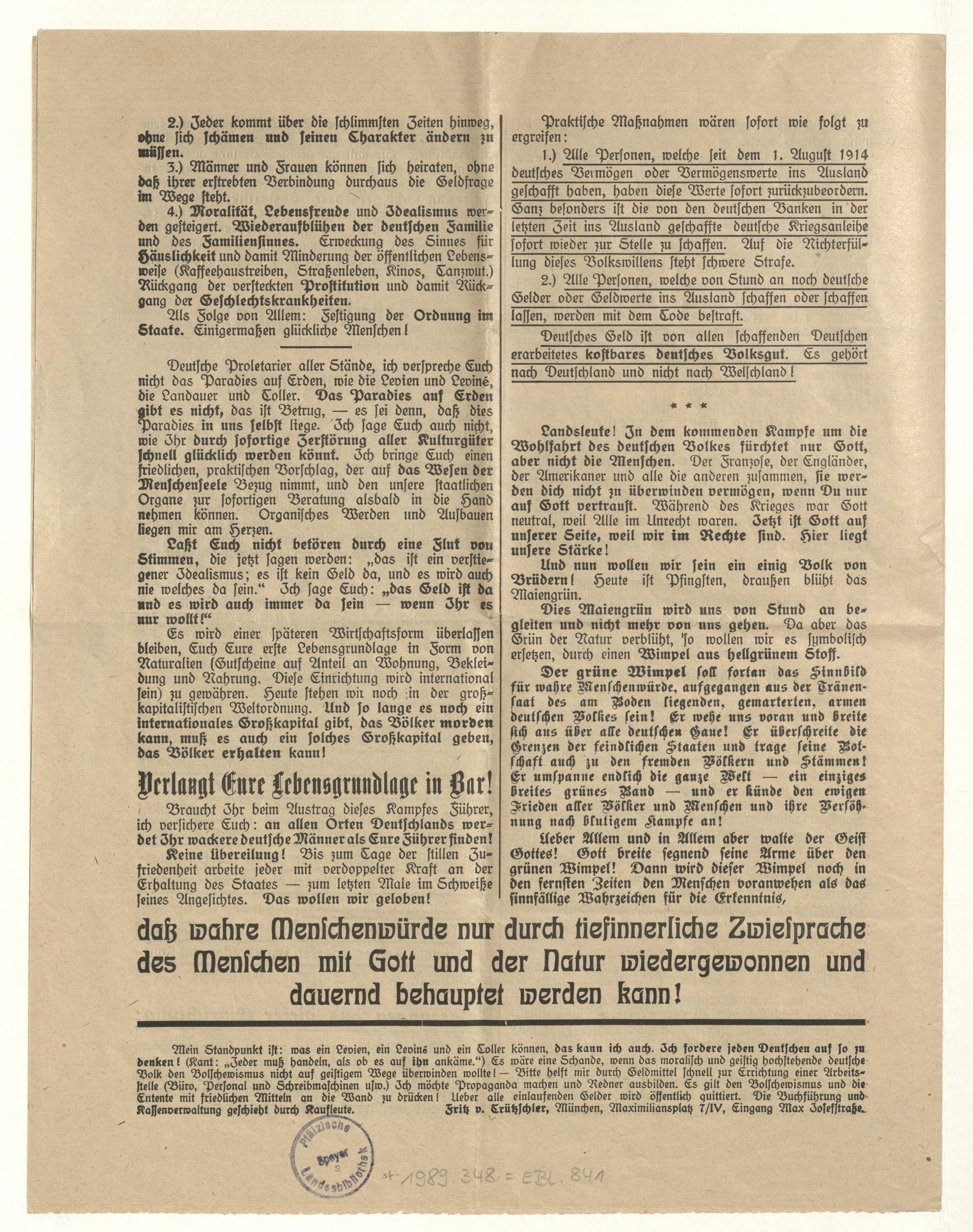 Aufruf an Deutschlands Volk! : eine Botschaft von der wahren Menschenwürde ; Münchener Pfingst-Flugschrift vom "grünen Wimpel"