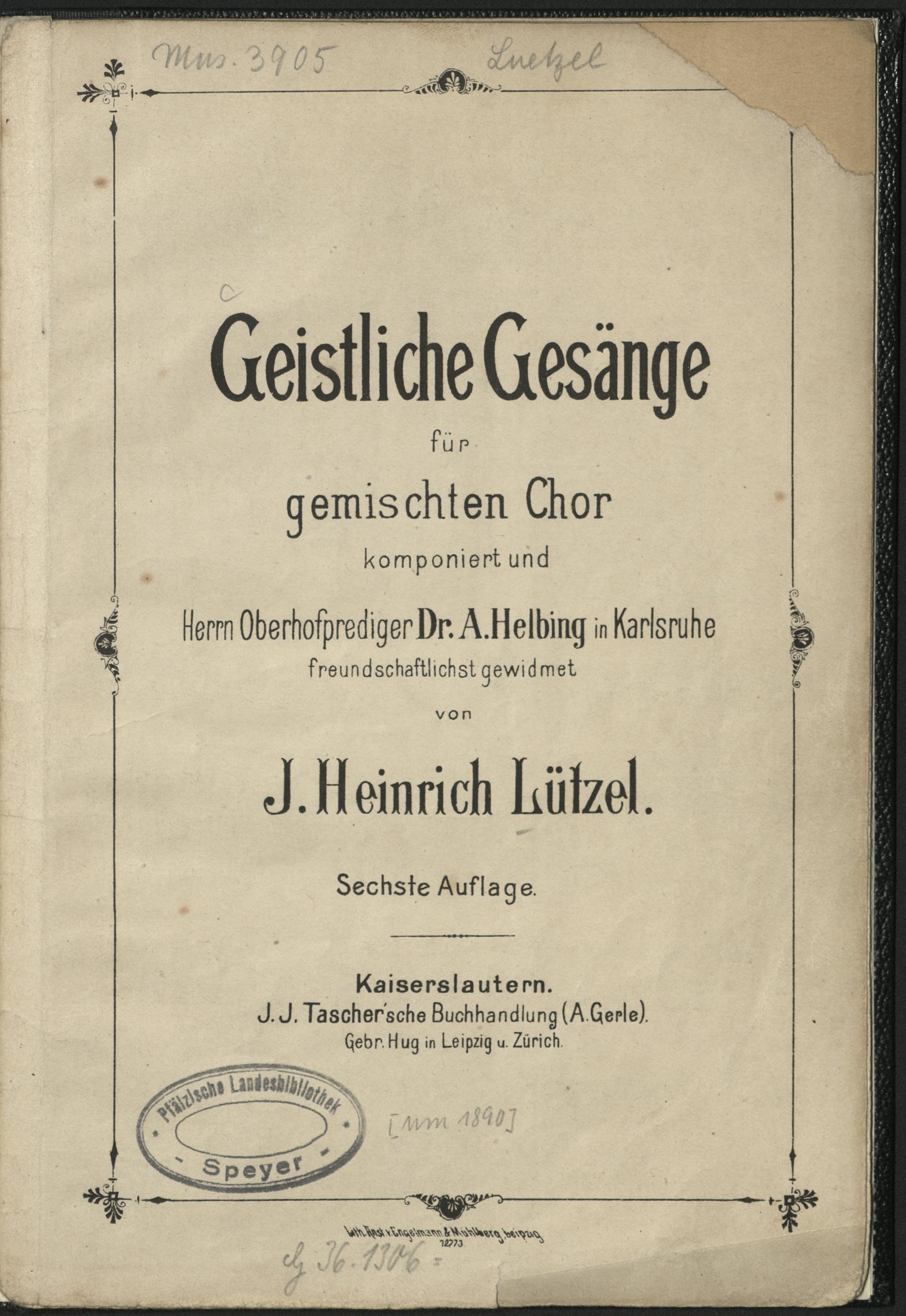 Geistliche Gesänge für gemischten Chor / komponiert und Herrn Oberhofprediger Dr. A. Helbing in Karlsruhe freundschaftlichst gewidmet von J. Heinrich Lützel