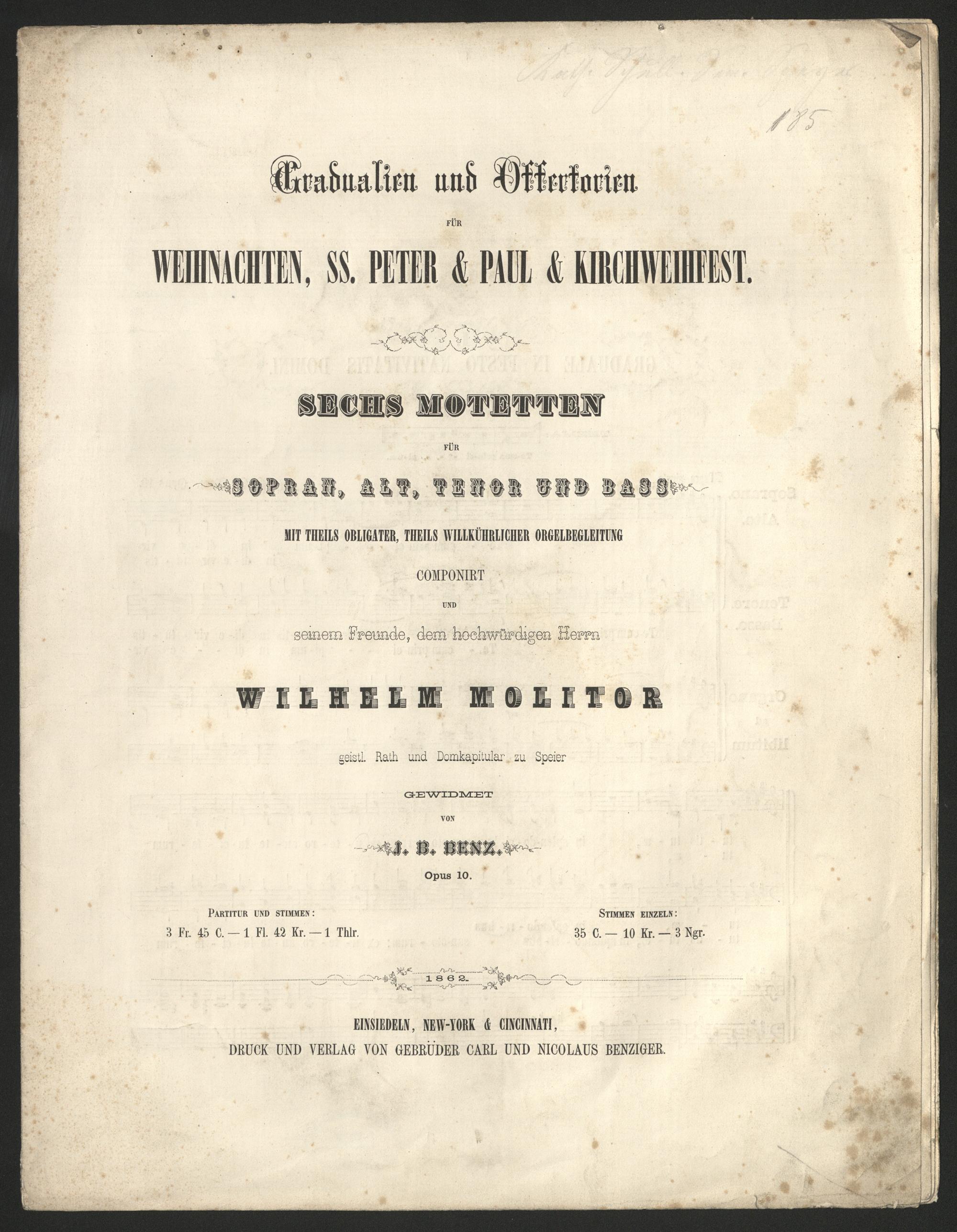 Gradualien und Offertorien für Weihnachten, SS. Peter & Paul & Kirchweihfest : sechs Motetten für Sopran, Alt, Tenor und Bass mit theils obligater, theils willkührlicher Orgelbegleitung : Op. 10 / componirt und seinem Freunde, dem hochwürdigen Herrn Wilhelm Molitor, geistl. Rath und Domkapitular zu Speier gewidmet von J. B. Benz