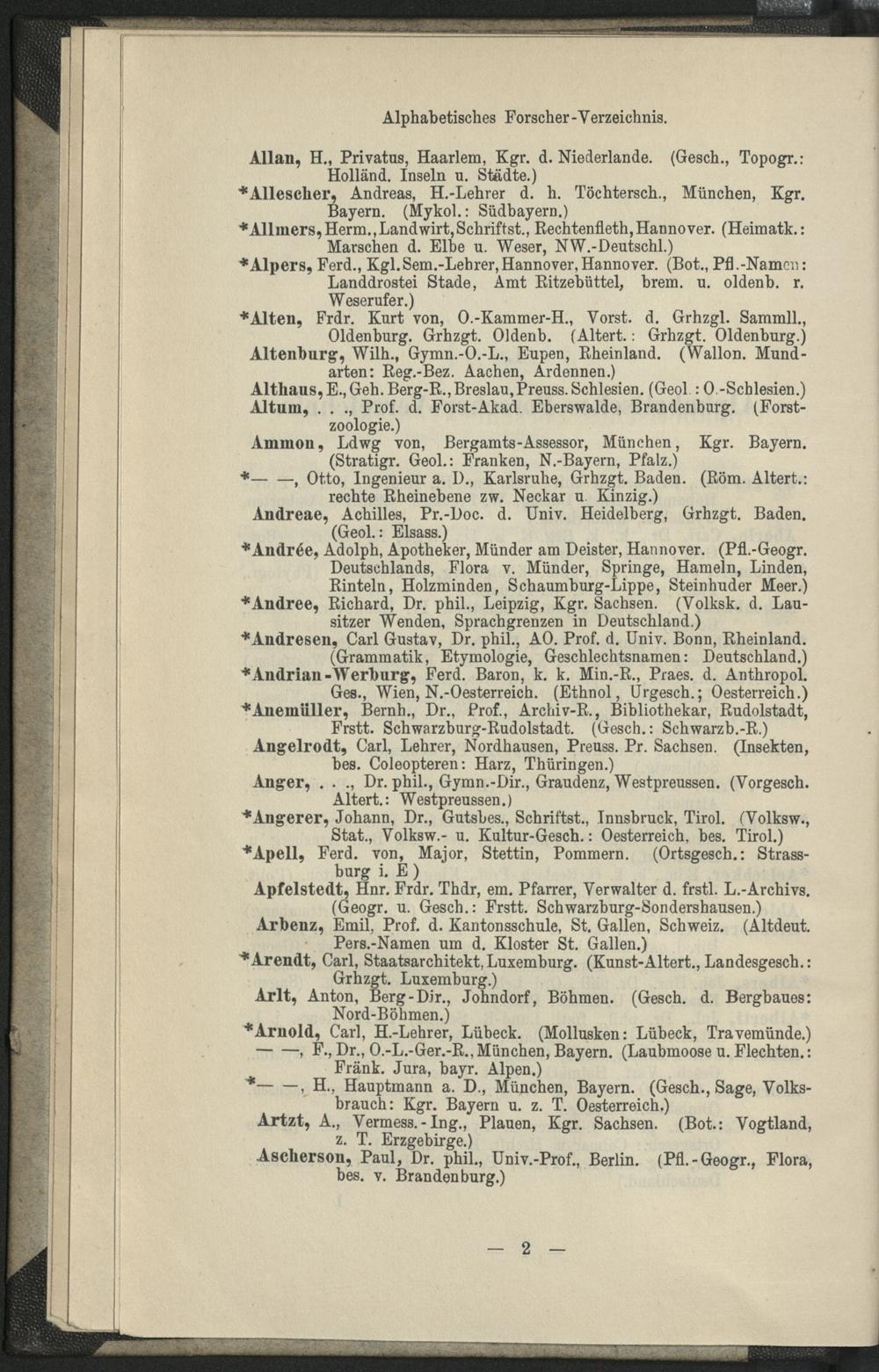 II. Forscher-Verzeichnis nach Land- und Ortschaften alphabetische geordnet.