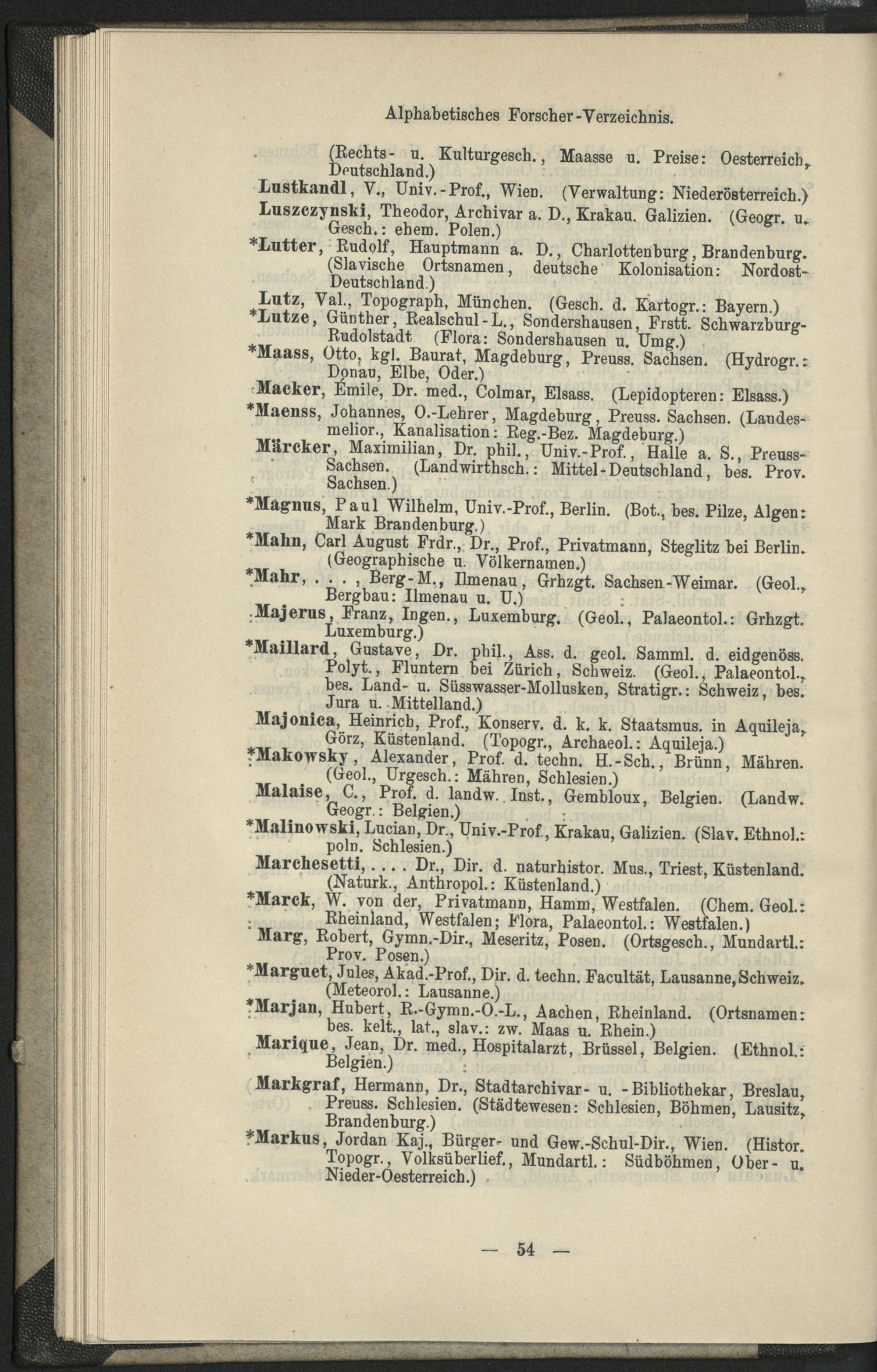 II. Forscher-Verzeichnis nach Land- und Ortschaften alphabetische geordnet.