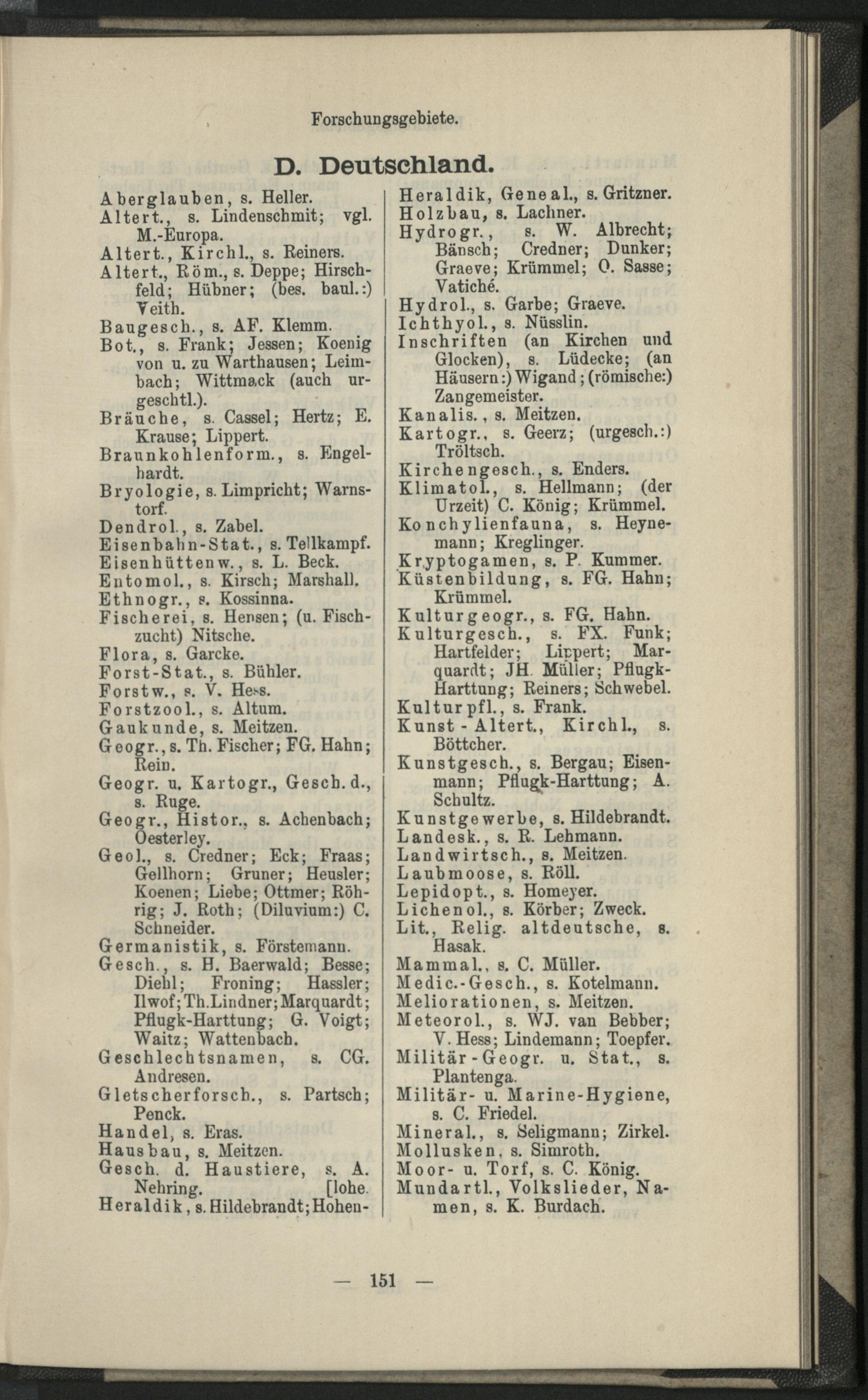 V. Forschungszweige nach den von den Forschern selbst gegebenen Stichworten alphabetisch geordnet.