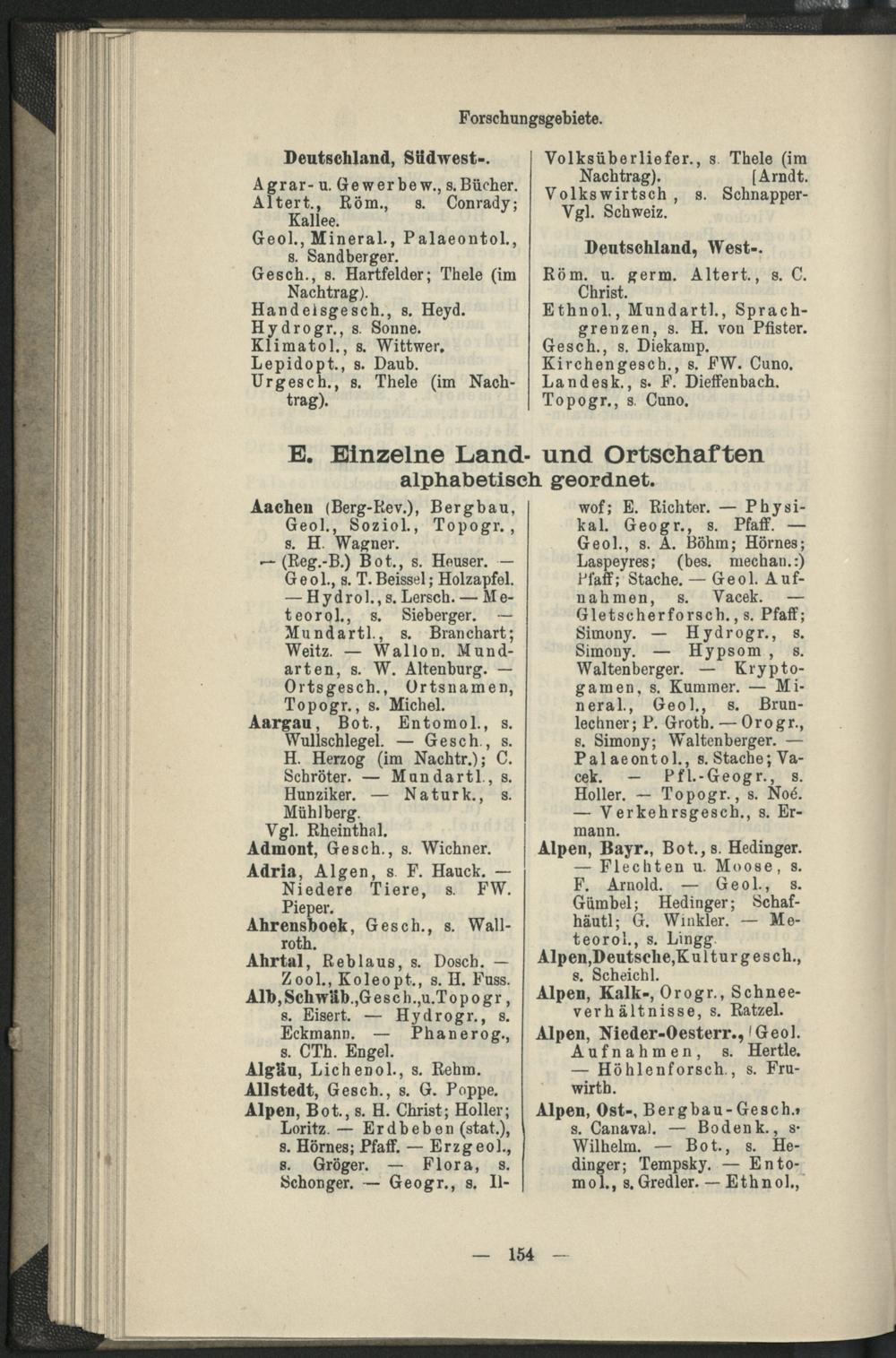 V. Forschungszweige nach den von den Forschern selbst gegebenen Stichworten alphabetisch geordnet.