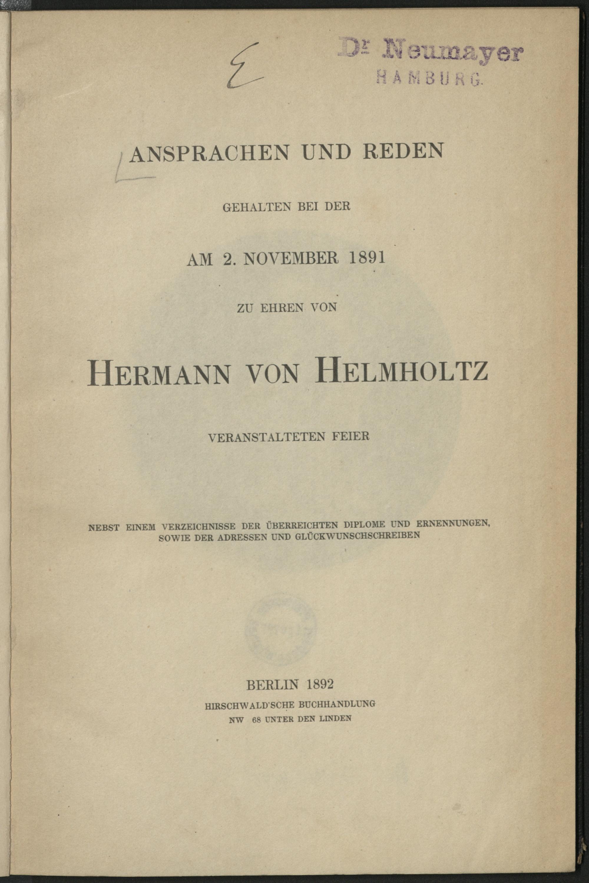 Ansprachen und Reden gehalten bei der am 2. November 1891 zu Ehren von Hermann von Helmholtz veranstalteten Feier : nebst einem Verzeichnis der überreichten Diplome und Ernennungen, sowie der Adressen und Glückwunschschreiben
