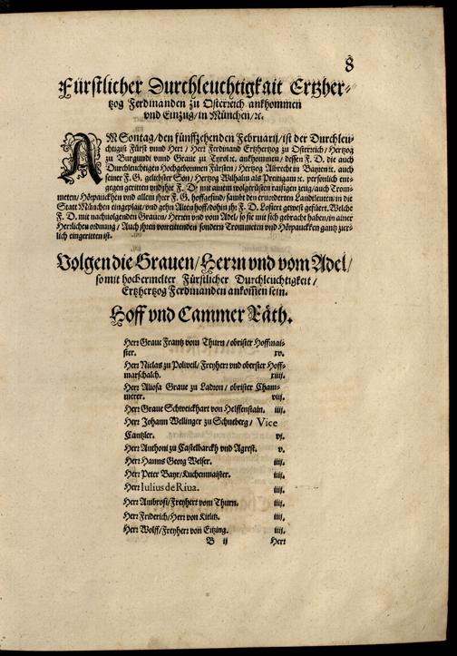 Kurtze doch gegründte beschreibung des Durchleuchtigen Hochgebornnen Fürsten vnnd Herren, Herren Wilhalmen, <<Pfaltzgrauen>> [Pfaltzgraven] bey Rhein ... Vnd derselben geliebsten Gemahel ... Frewlein Renata gebornne Hertzogin zu Lottringen vnd Parr, [et]c. gehalten Hochzeitlichen Ehren Fests : Auch welcher gestalt die darauff geladnen Potentaten vnd Fürsten Personlich, oder durch jre abgesandte Potschaffter erschinen ; Vnd dann was für Herrliche Ritterspil, zu Roß vnd Fueß, mit Thurnieren, Rennen vnd Stechen ... in der Fürstlichen Haubtstat München gehalten worden sein, den zwenvndzwaintzigisten vnd nachuolgendt tag Februarij, Jm 1568. Jar / [Hanns Wagner]