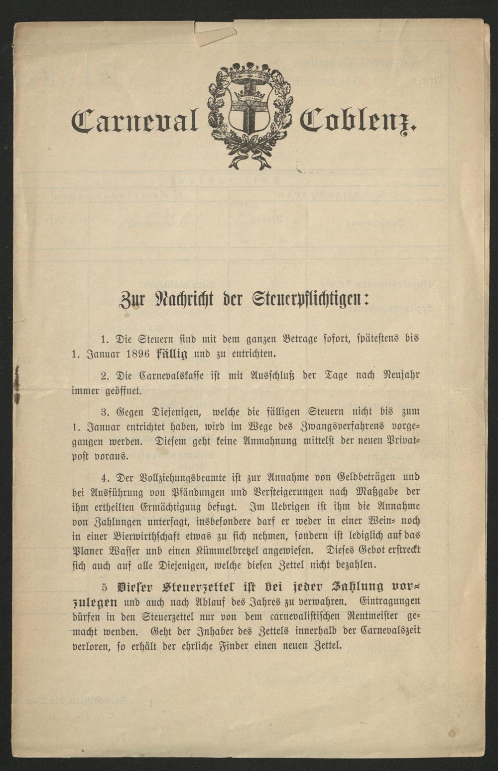 Carneval Coblenz : zur Nachricht der Steuerpflichtigen : Carnevalsjahr 1896 / Coblenzer Carnevals-Gesellschaft. Der carnevalistische Rentmeister Nimmersatt
