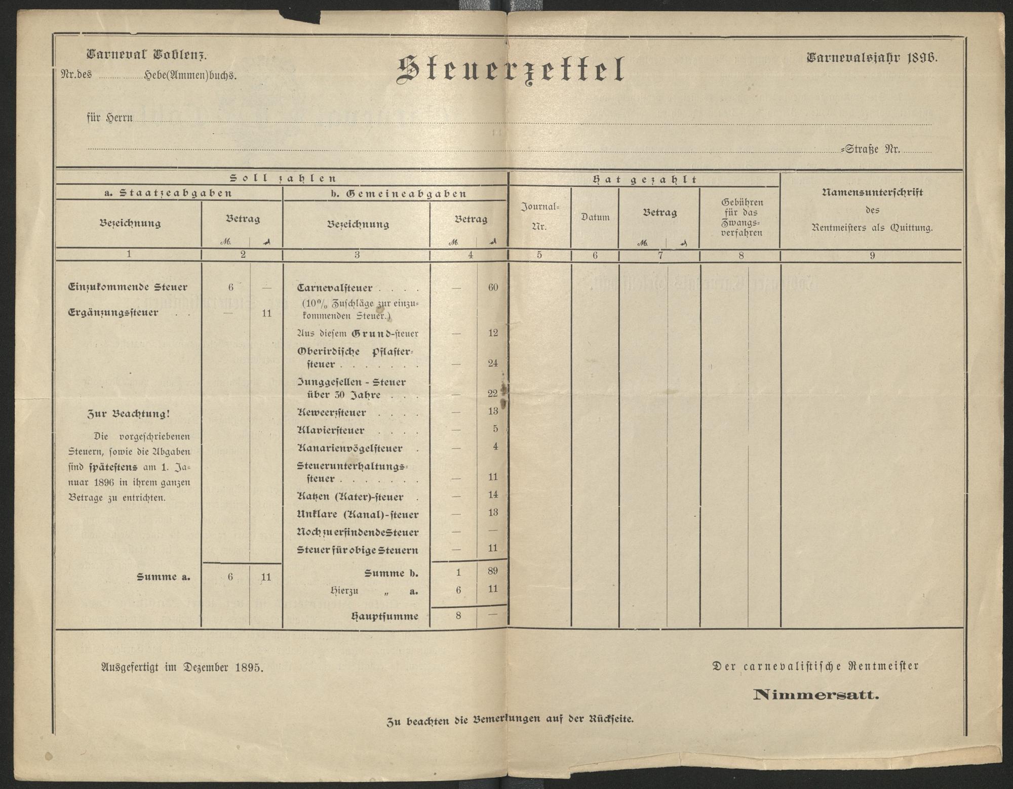 Carneval Coblenz : zur Nachricht der Steuerpflichtigen : Carnevalsjahr 1896 / Coblenzer Carnevals-Gesellschaft. Der carnevalistische Rentmeister Nimmersatt