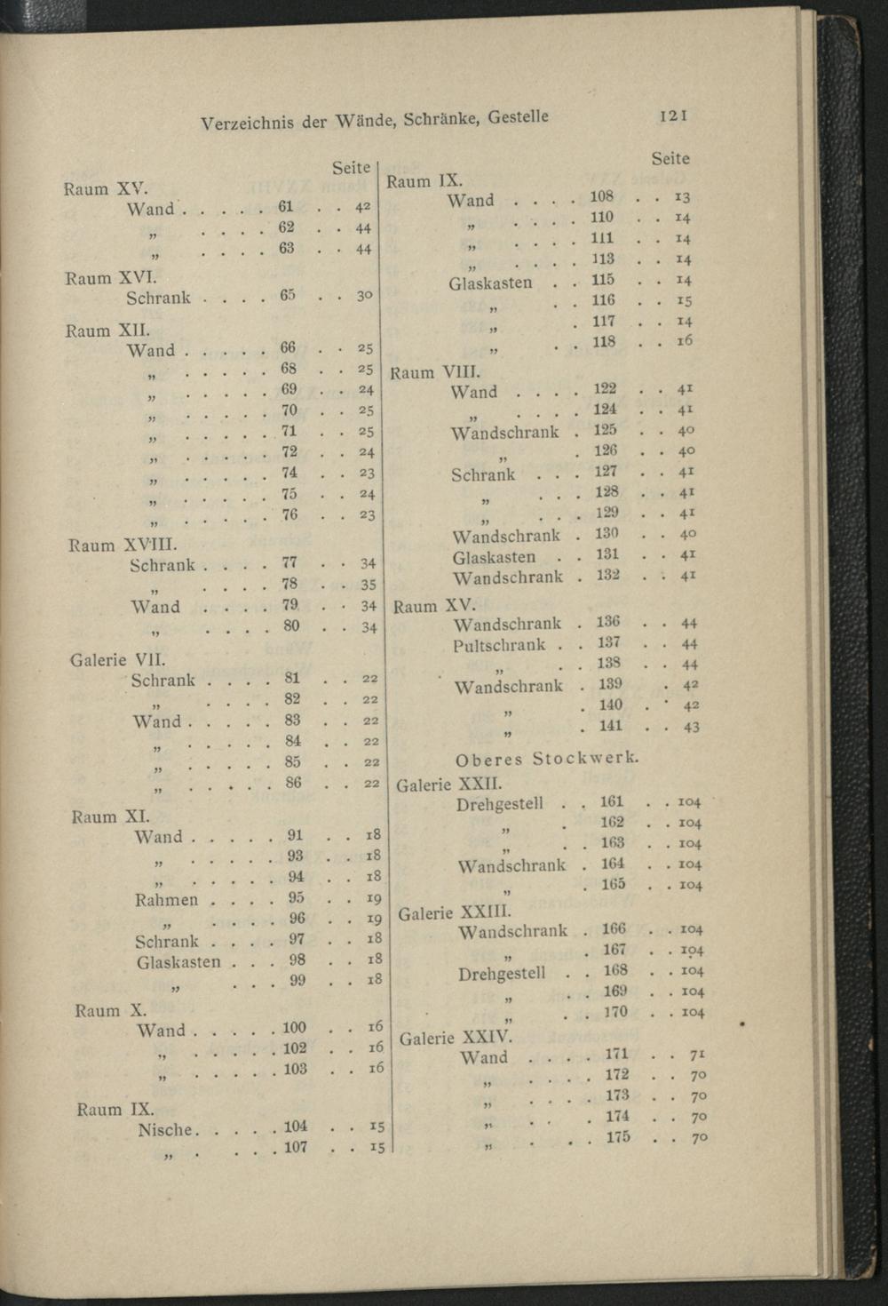 Verzeichnis der im Führer genannten Wände, Schränke und Gestelle