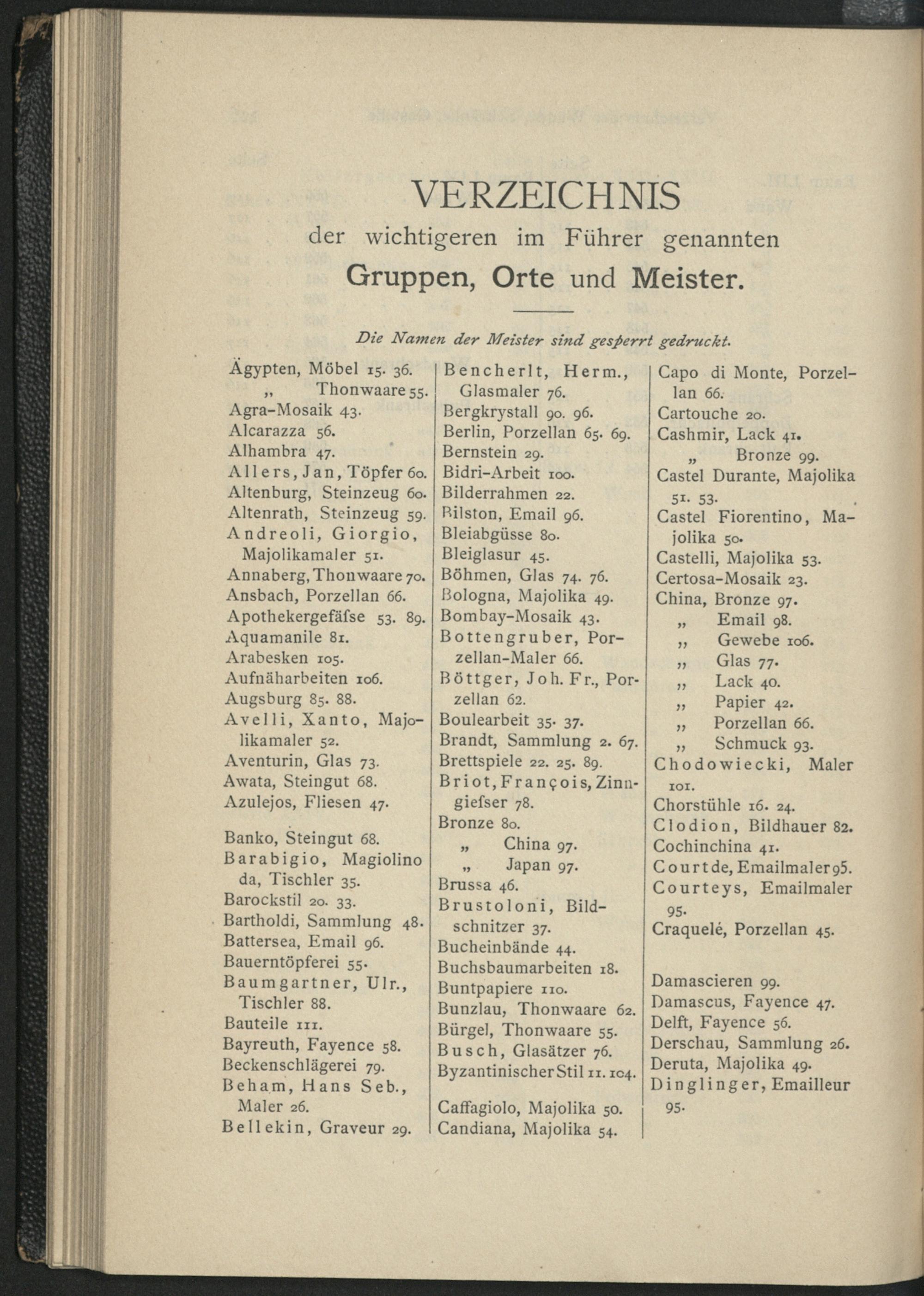Verzeichnis der wichtigeren im Führer genannten Gruppen, Orte und Meister.