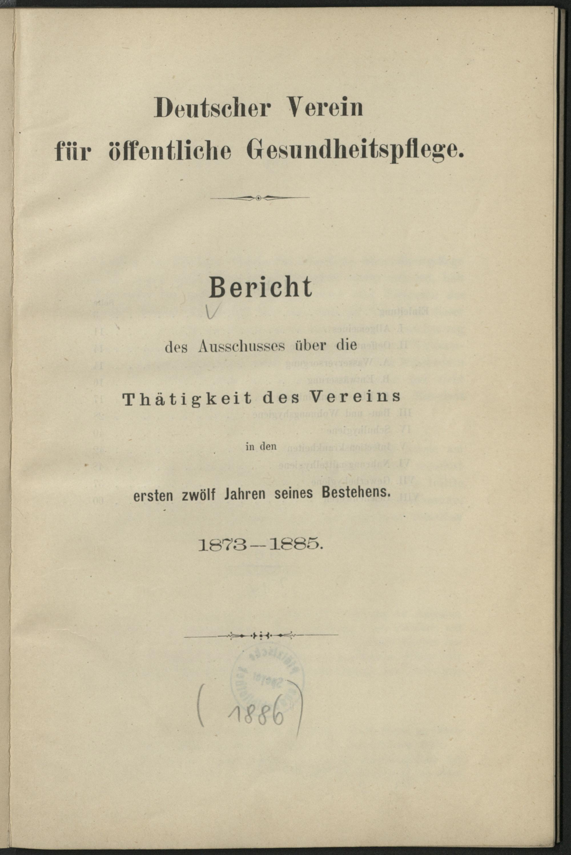 Bericht des Ausschusses über die Thätigkeit des Vereins in den ersten 12 Jahren seines Bestehens : 1873-1885 / Dt. Verein für öffentliche Gesundheitspflege