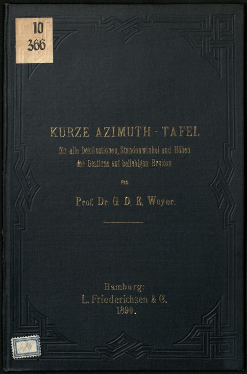 Kurze Azimuth-Tafel für alle Deklinationen, Stundenwinkel und Höhen der Gestirne auf beliebigen Breiten : zum täglichen Seegebrauch bei der Bestimmung der Missweisung des Kompasses und bei der Anwendung von Sumner's Methode für die geographische Ortsbestimmung / entworfen von G. D. E. Weyer
