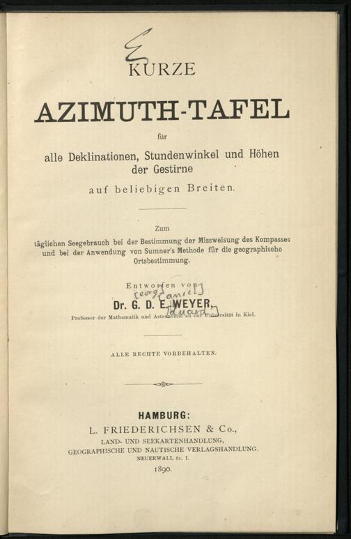 Kurze Azimuth-Tafel für alle Deklinationen, Stundenwinkel und Höhen der Gestirne auf beliebigen Breiten : zum täglichen Seegebrauch bei der Bestimmung der Missweisung des Kompasses und bei der Anwendung von Sumner's Methode für die geographische Ortsbestimmung / entworfen von G. D. E. Weyer