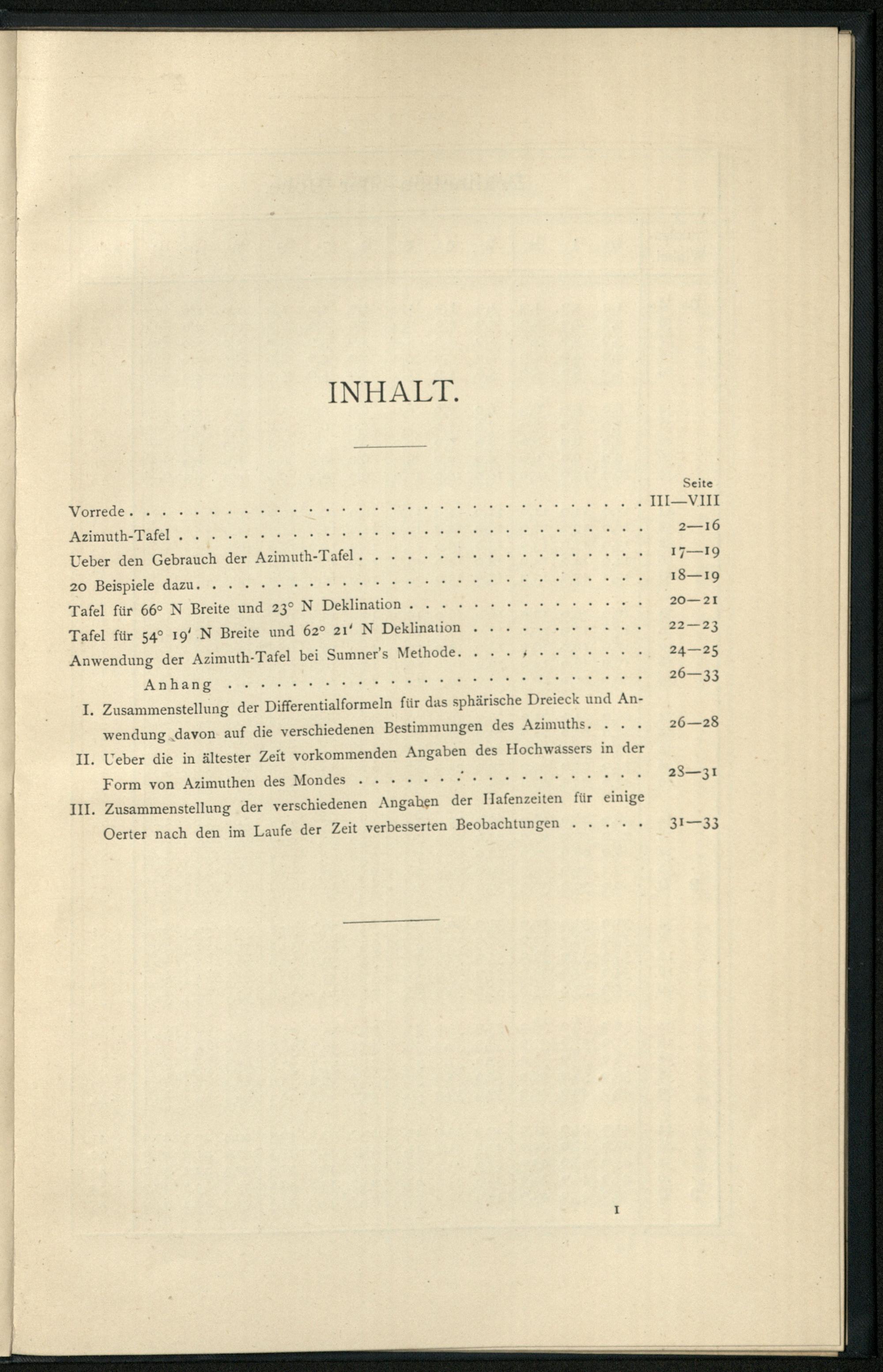 Kurze Azimuth-Tafel für alle Deklinationen, Stundenwinkel und Höhen der Gestirne auf beliebigen Breiten : zum täglichen Seegebrauch bei der Bestimmung der Missweisung des Kompasses und bei der Anwendung von Sumner's Methode für die geographische Ortsbestimmung / entworfen von G. D. E. Weyer