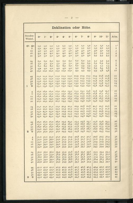 Kurze Azimuth-Tafel für alle Deklinationen, Stundenwinkel und Höhen der Gestirne auf beliebigen Breiten : zum täglichen Seegebrauch bei der Bestimmung der Missweisung des Kompasses und bei der Anwendung von Sumner's Methode für die geographische Ortsbestimmung / entworfen von G. D. E. Weyer