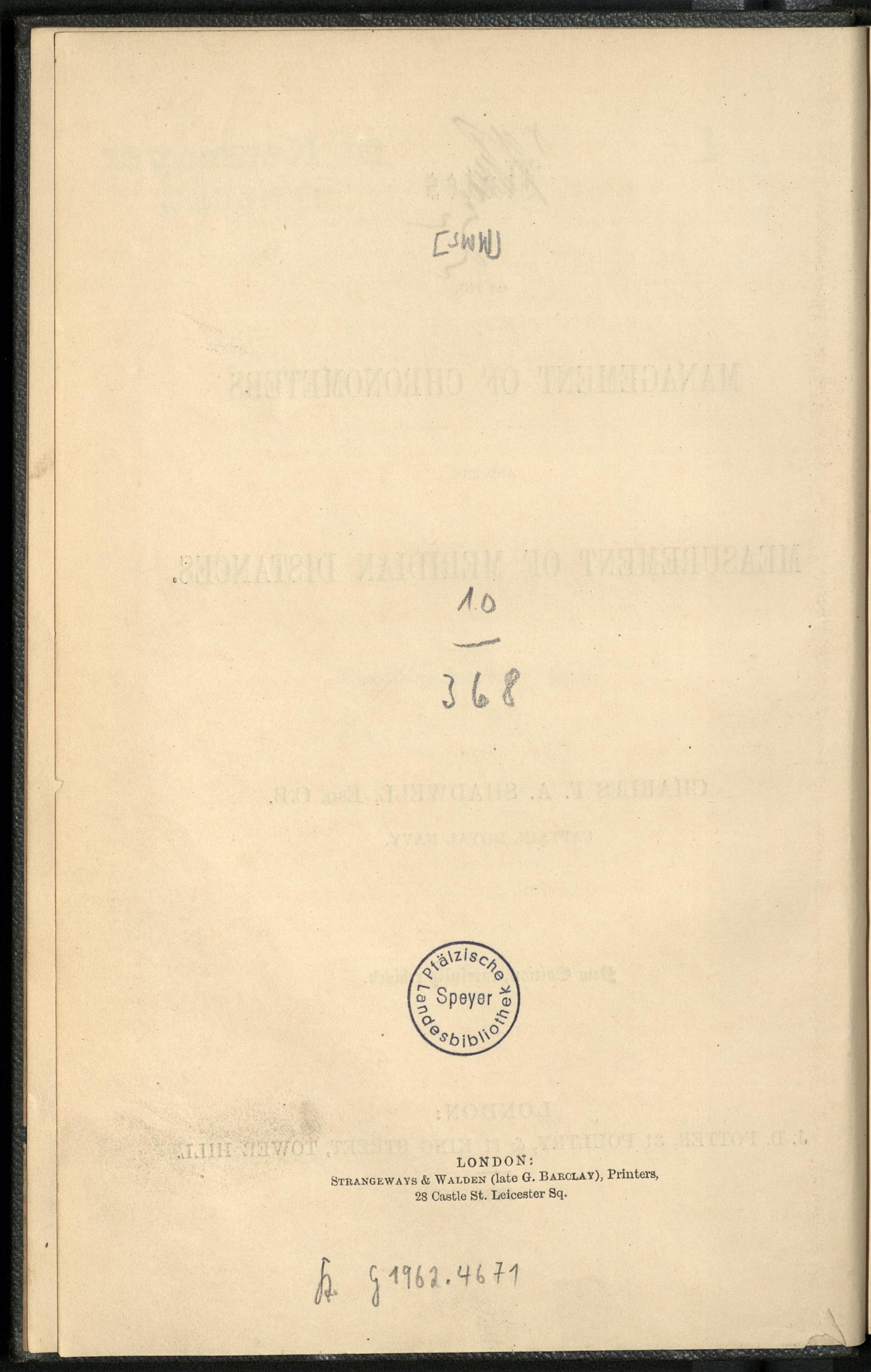 Notes on the management of chronometers and the measurement of meridian distances / Charles F. A. Shadwell