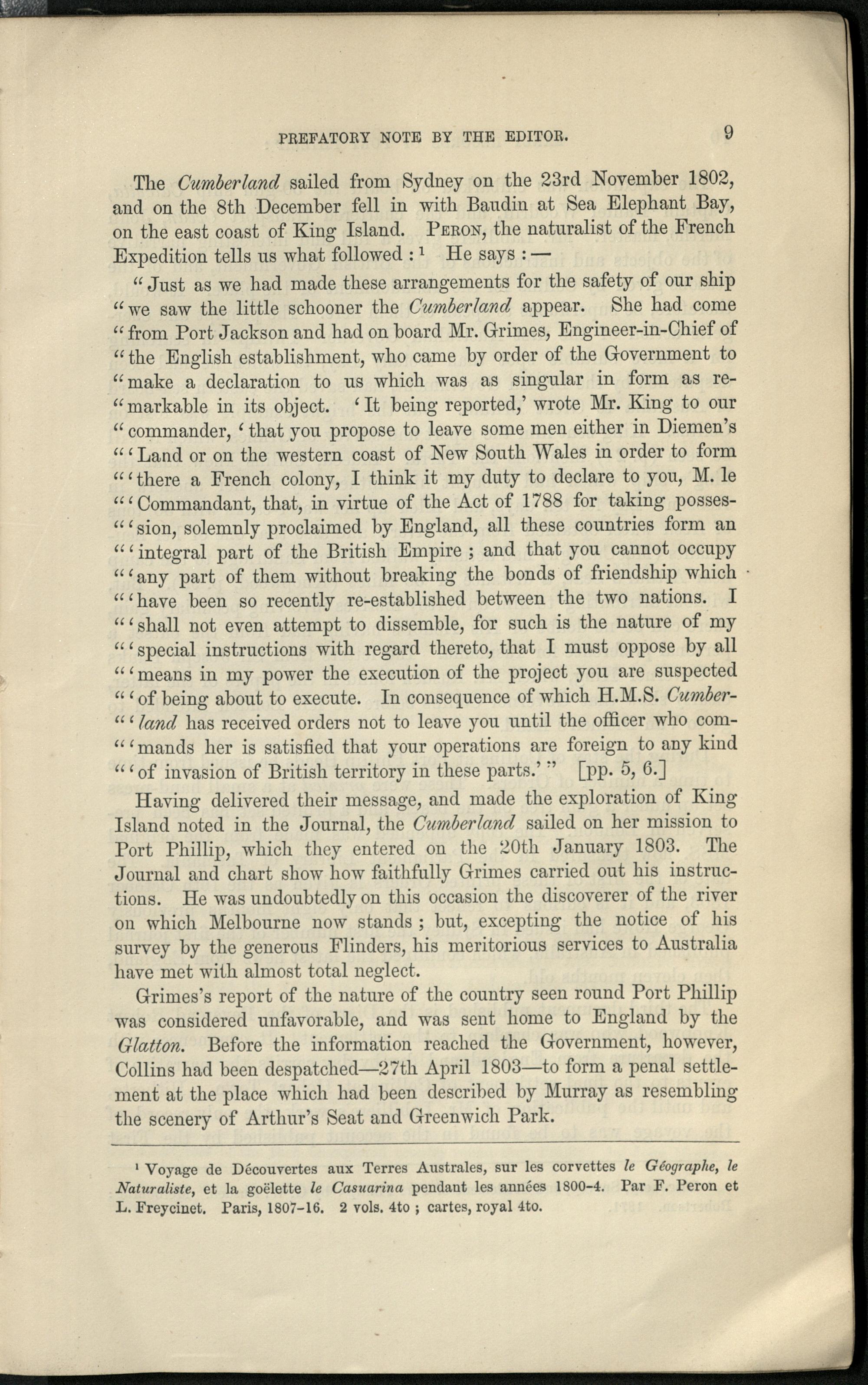 The voyage of his Majesty`s colonial schooner "Cumberland", from Sidney to King Island and Port Phillip in 1802-3.