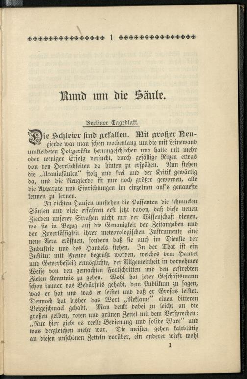 Stimmen der Presse über die Urania-Säule / Urania-Uhren- und Säulen-Commandit-Gesellschaft