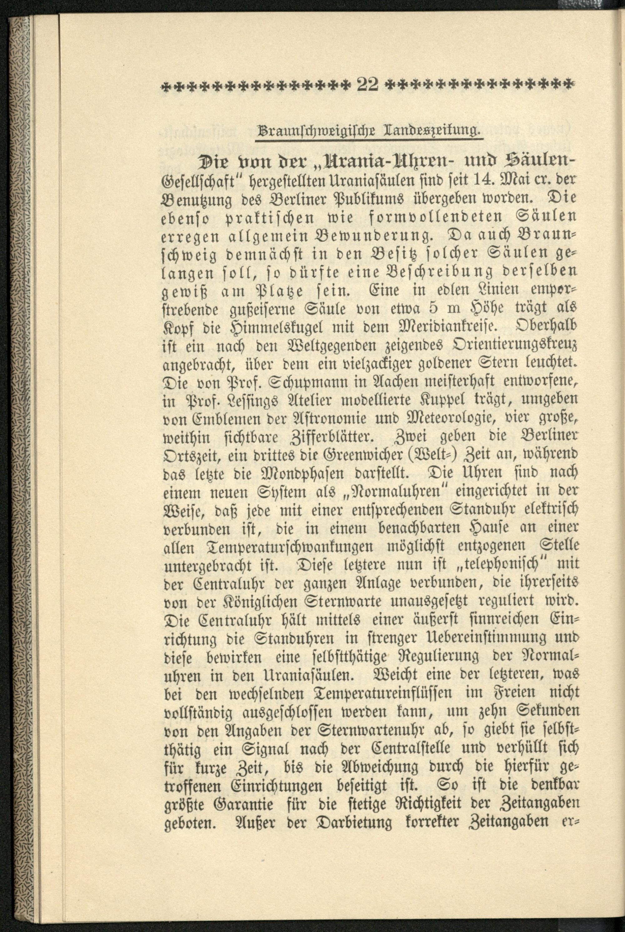 Stimmen der Presse über die Urania-Säule / Urania-Uhren- und Säulen-Commandit-Gesellschaft