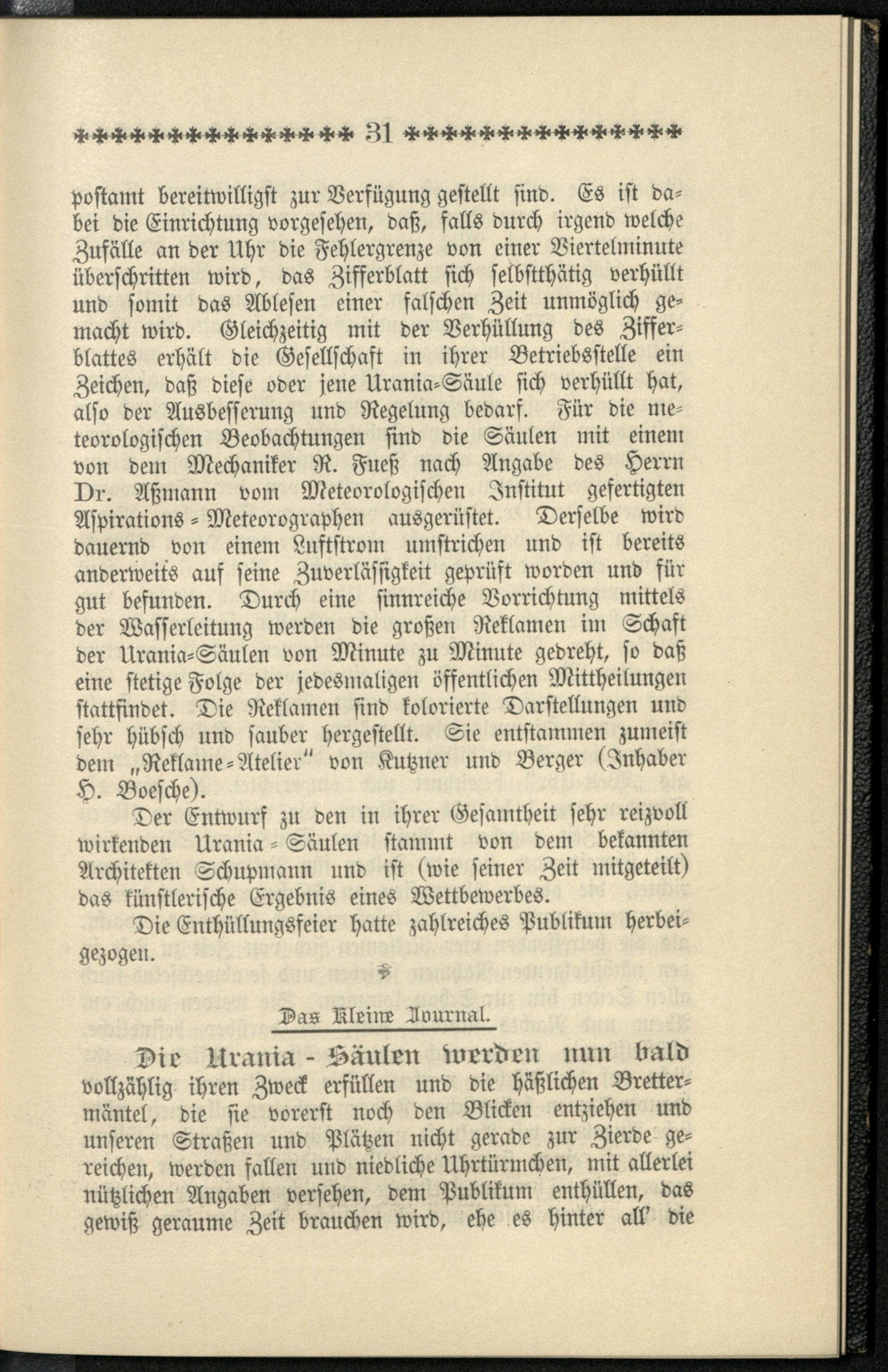 Stimmen der Presse über die Urania-Säule / Urania-Uhren- und Säulen-Commandit-Gesellschaft