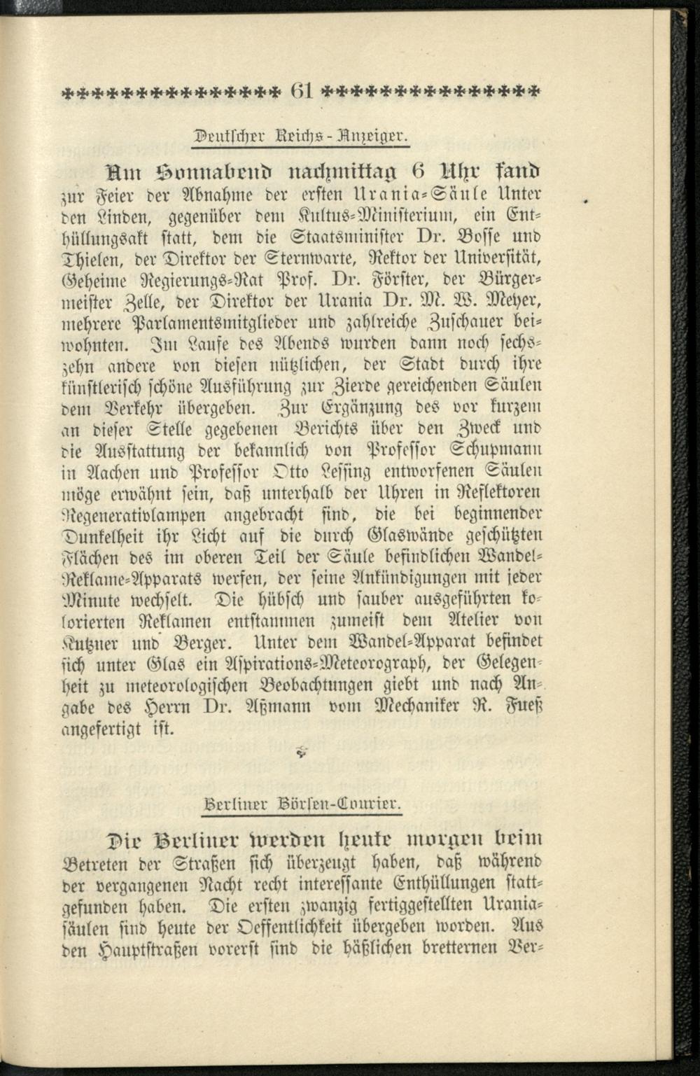 Stimmen der Presse über die Urania-Säule / Urania-Uhren- und Säulen-Commandit-Gesellschaft