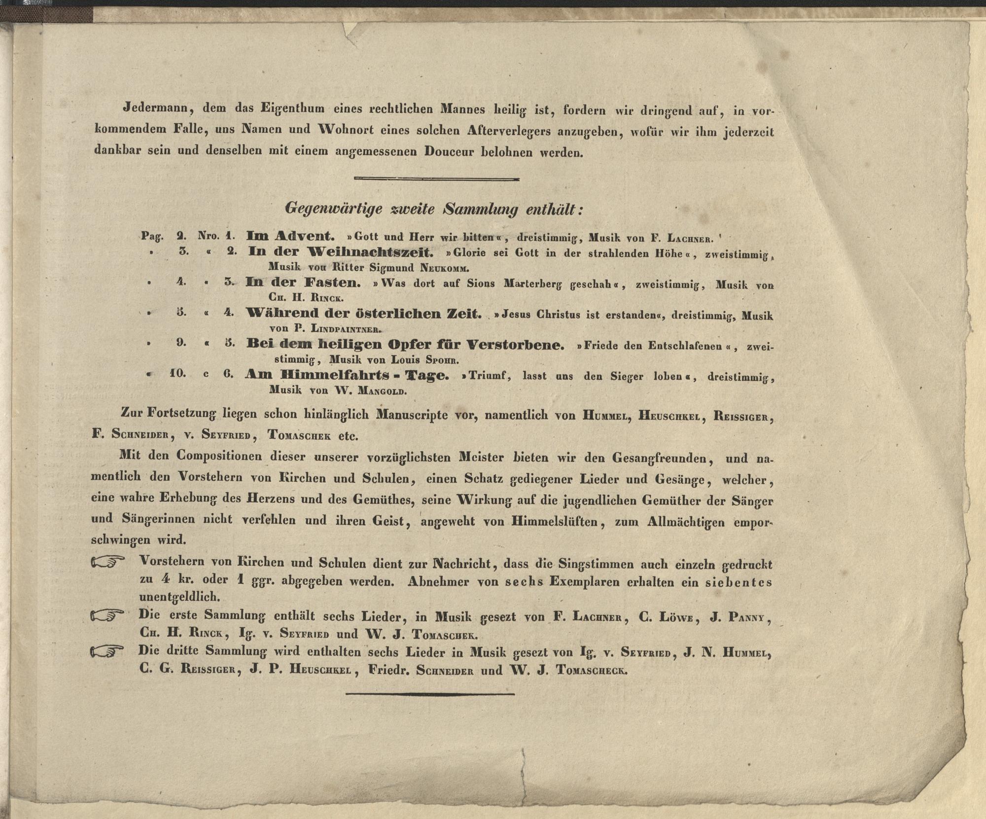 Zweite Sammlung mehrstimmiger Gesänge für Sopran und Altstimmen : mit und ohne Orgel-Begleitung / zunächst für die Kinder der Mainzer Armenschule zum Vortrage während der Wandlung in der heiligen Messe geschrieben von dem Mitvorsteher der Anstalt, Jacob Neus. ; In Musik gesetzt von F. Lachner, Ritter S. Neukomm, Ch.H. Rinck, P. Lindpaintner, Louis Spohr und Wilhelm Mangold