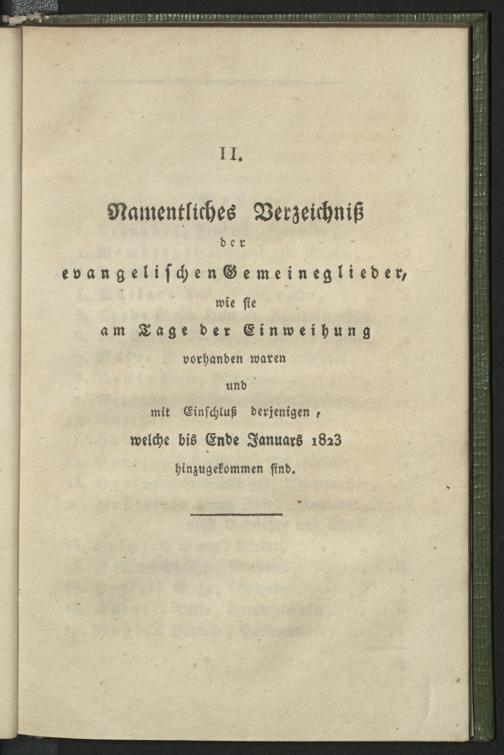 II. Namentliches Verzeichniß der evangelischen Gemeineglieder, wie sie am Tage der Einweihung vorhanden waren und mit Einschluß derjenigen, welche bis Ende Januars 1823 hinzugekommen sind.