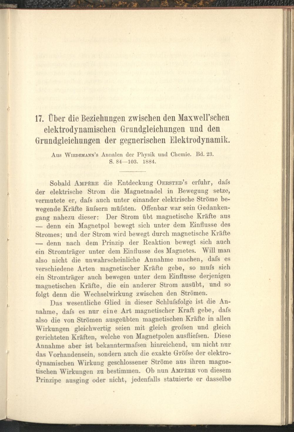 17. Über die Beziehungen zwischen den Maxwell'schen elektrodynamischen Grundgleichungen...