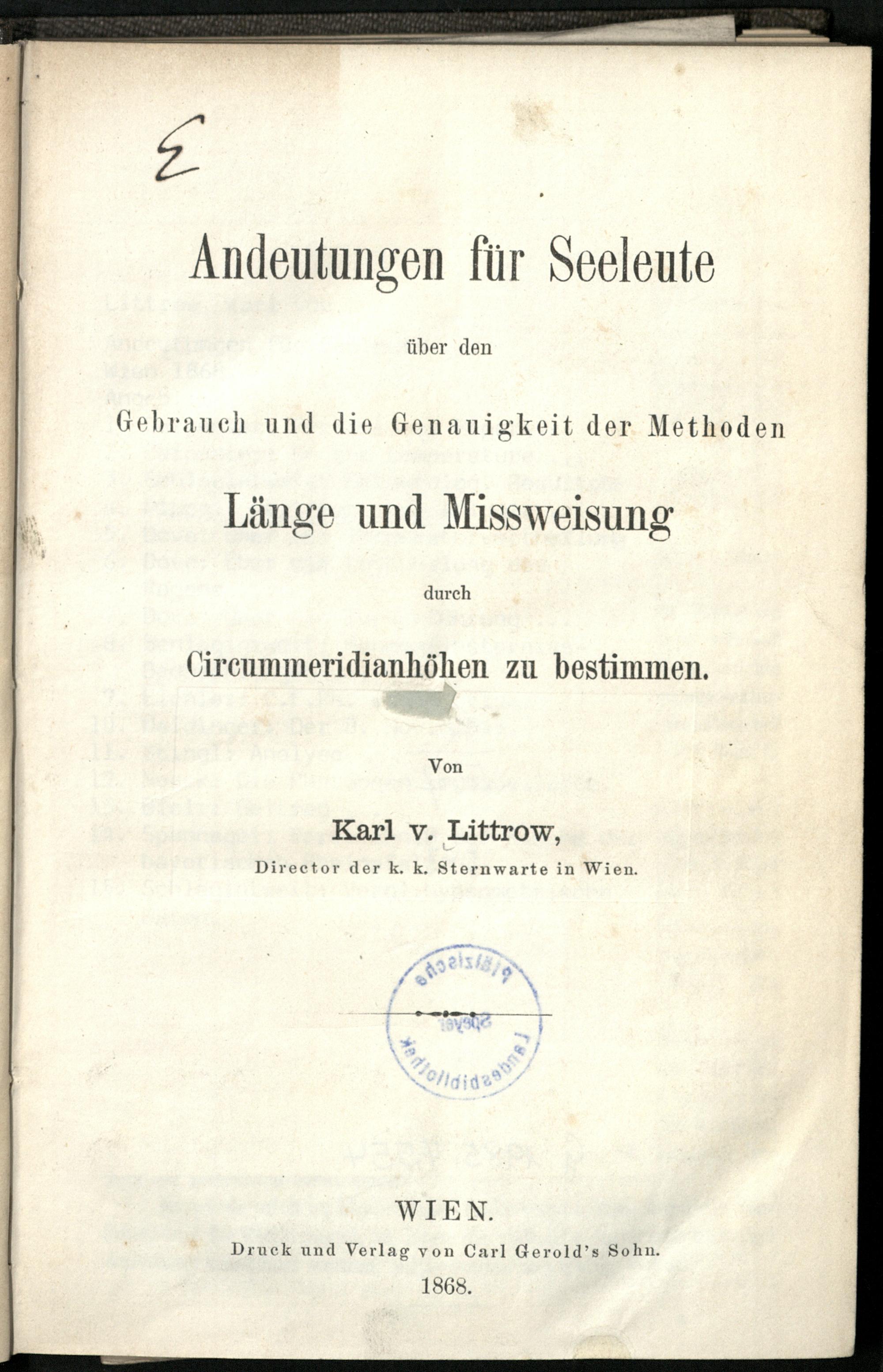Andeutungen für Seeleute über den Gebrauch und die Genauigkeit der Methoden Länge und Missweisung durch Circummeridianhöhen zu bestimmen / Karl von Littrow