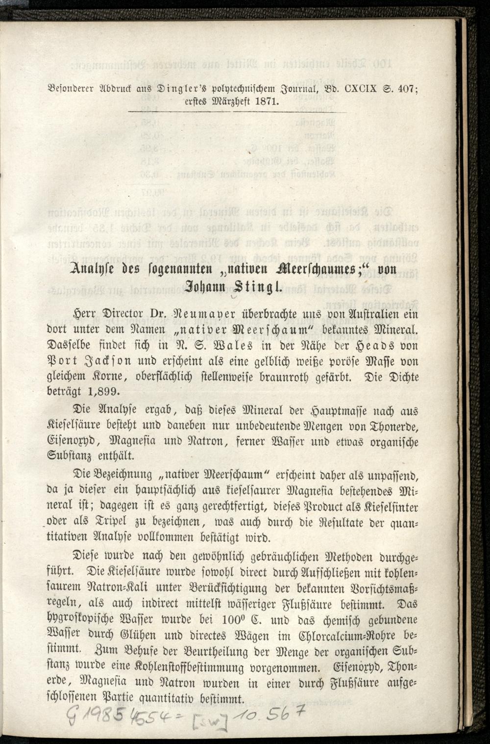 Analyse des sogenannten "nativen Meerschaumes" / von Johann Stingl