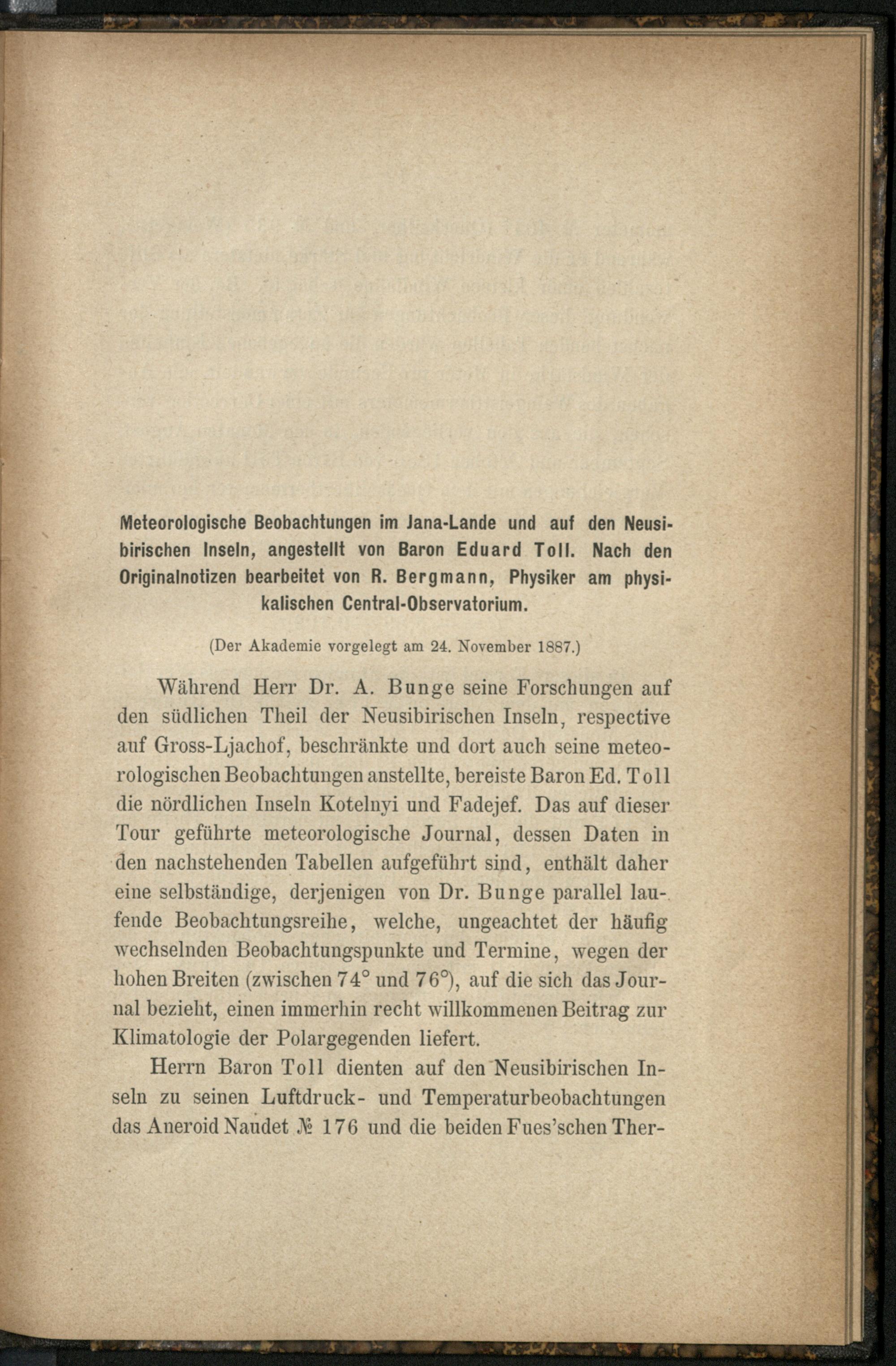 Meteorologische Beobachtungen im Jana-Lande und auf den neusibirischen Inseln / angestellt von Alex. Bunge u. Ed. Tull. Nach den Originalnotizen bearb. von R. Bergmann