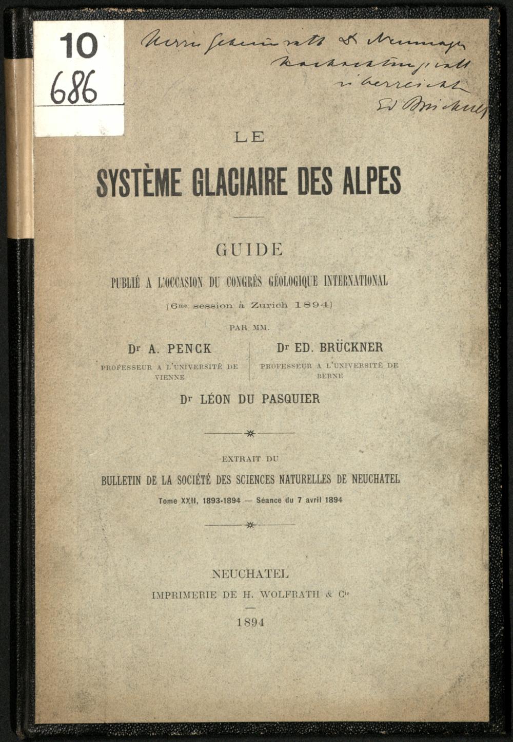 Le système glaciaire des Alpes : guide publié à l'occasion du congrès géologique international ; 6me session à Zürich 1894 / par A. Penck ; Ed. Brückner ; Léon du Pasquier