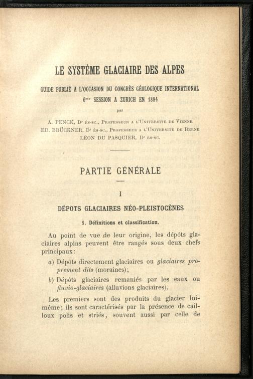 Le système glaciaire des Alpes : guide publié à l'occasion du congrès géologique international ; 6me session à Zürich 1894 / par A. Penck ; Ed. Brückner ; Léon du Pasquier