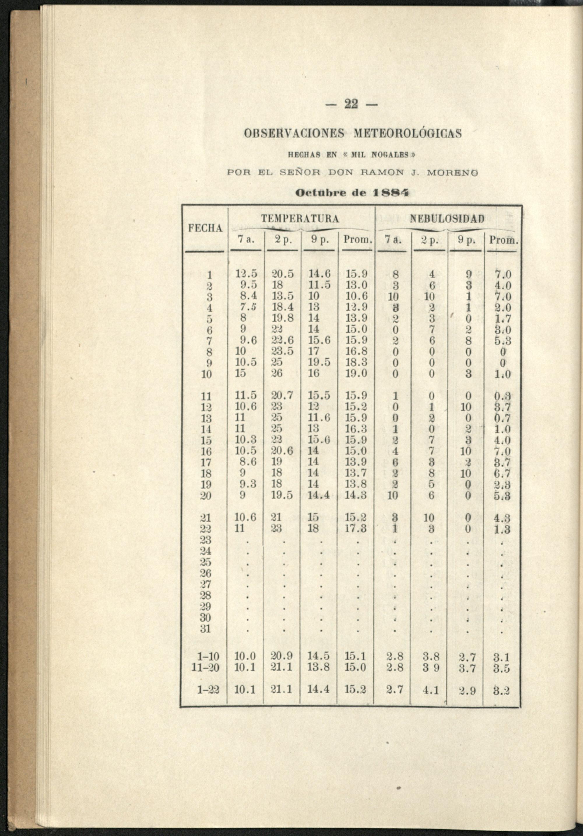 Observaciones meteorológicas : hechas en Mil Nogales (Córdoba) / por Ramon J. Moreno y publ. por Oscar Doering