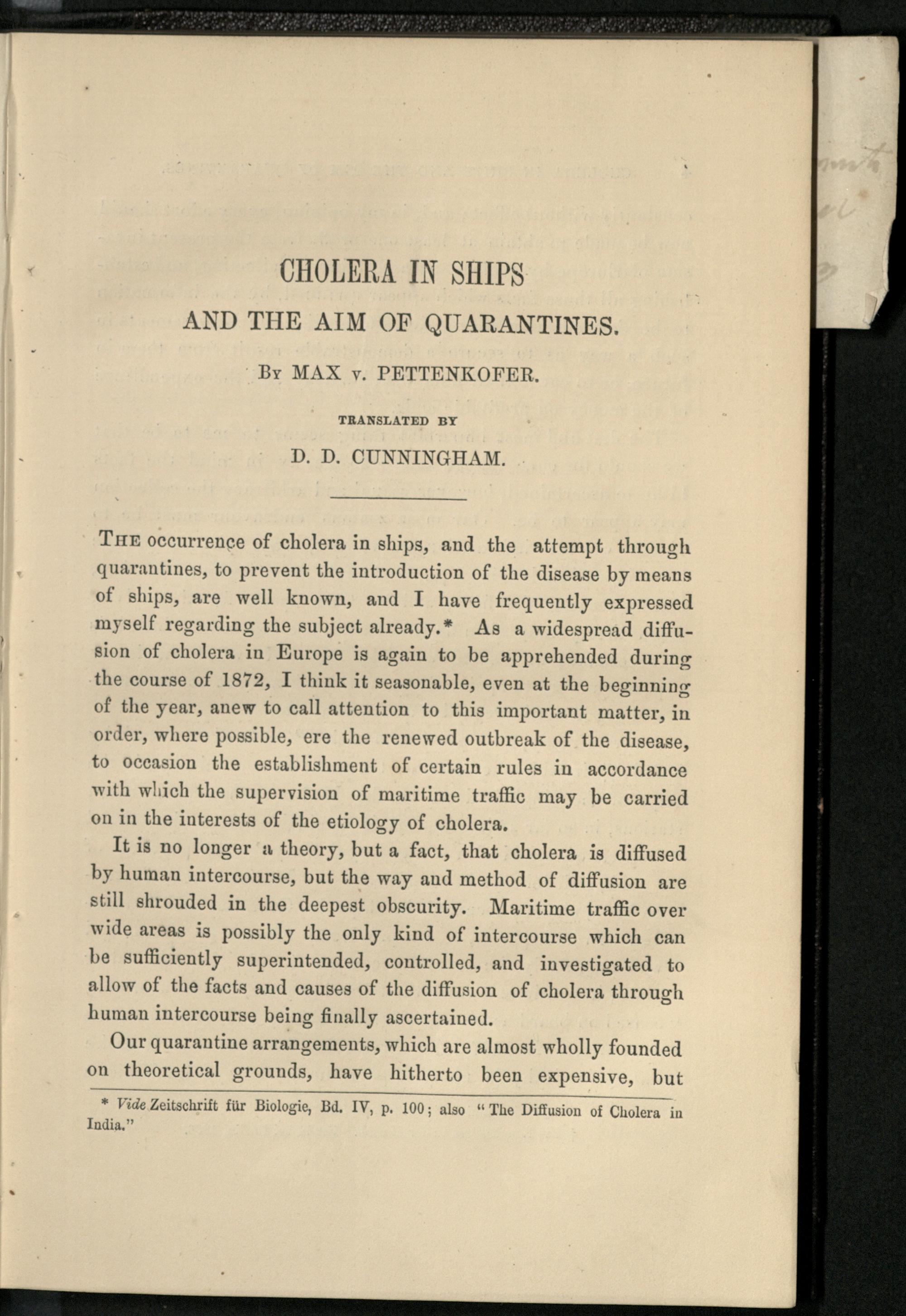 Cholera in Ships and the aim of quarantines / by Max v. Pettenkofer. Translated by D.D. Cunningham