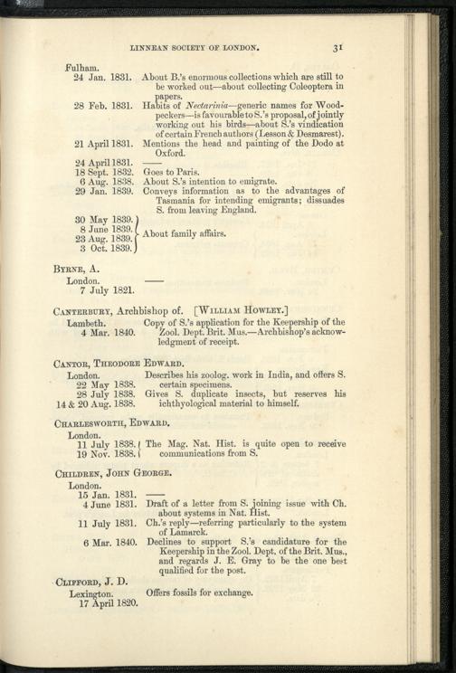Catalogue of the Swainson corrrespondence in the possession of the Linnean Socie...