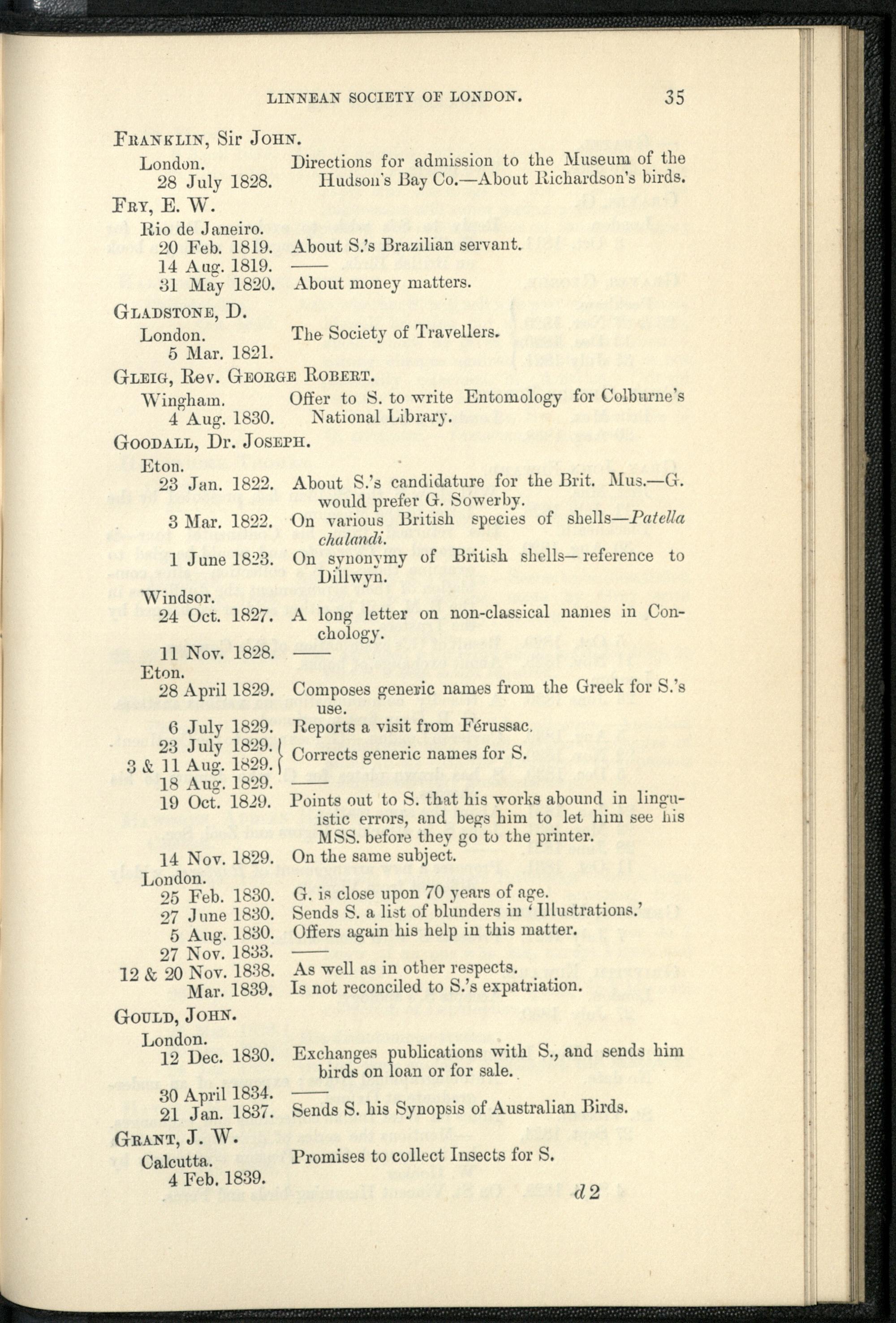 Catalogue of the Swainson corrrespondence in the possession of the Linnean Socie...