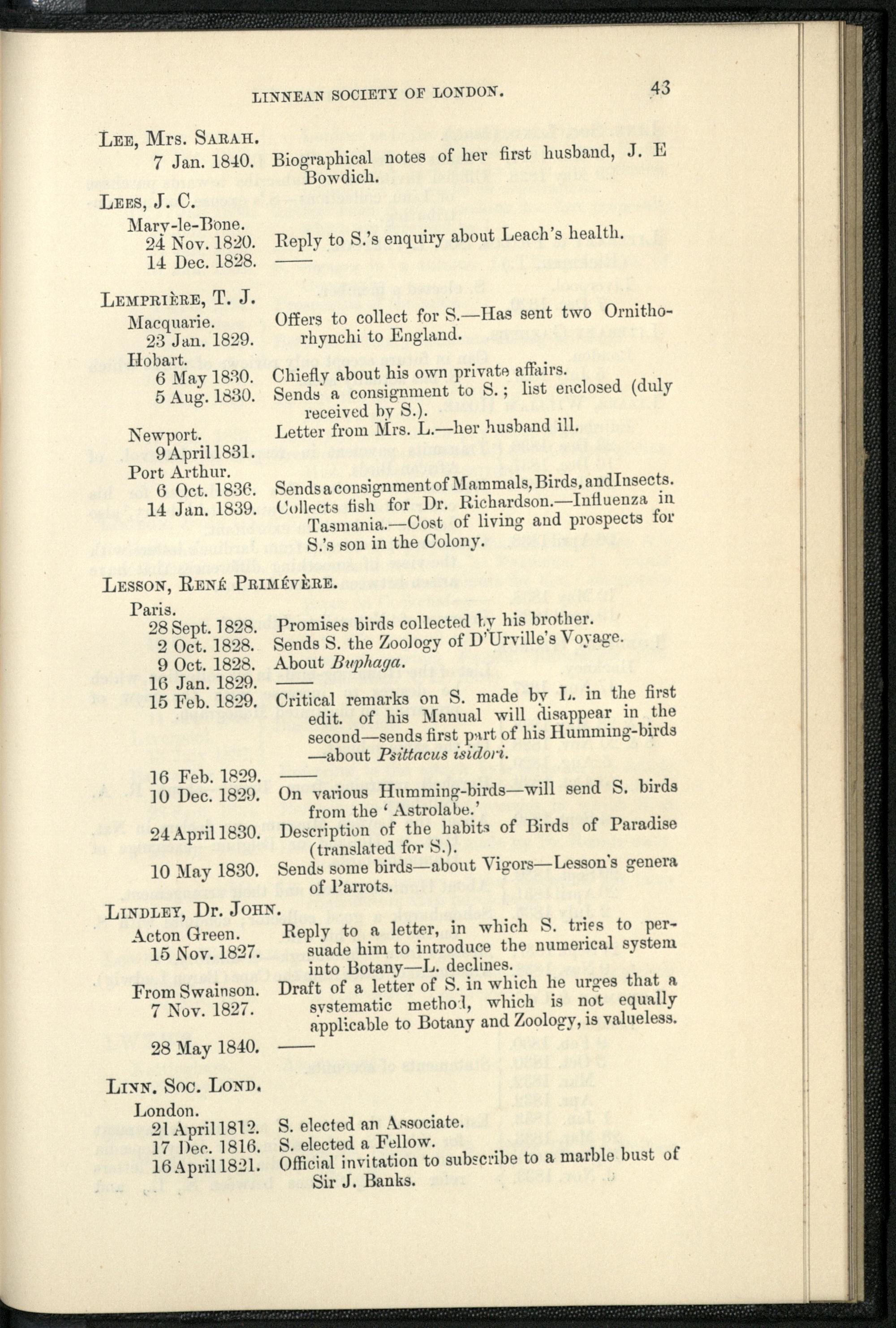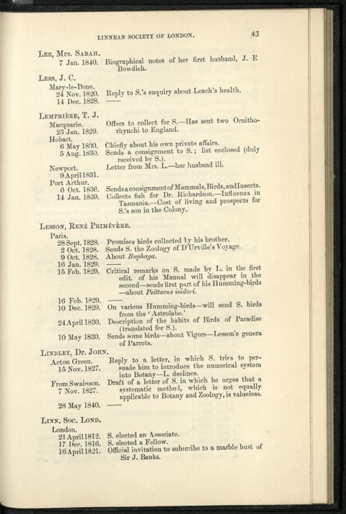 Catalogue of the Swainson corrrespondence in the possession of the Linnean Socie...