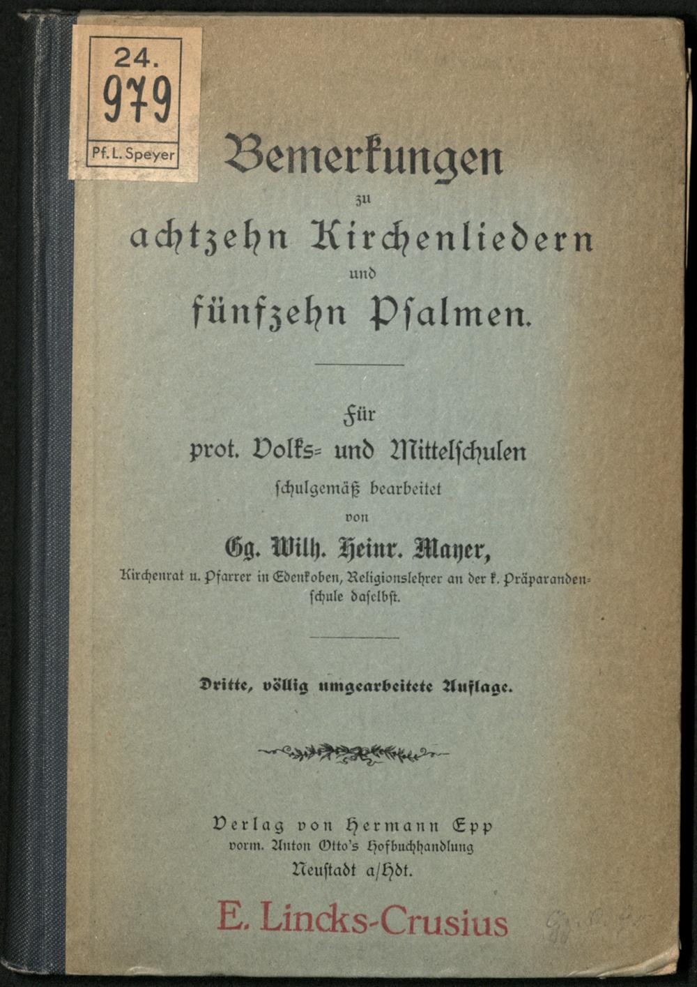 Bemerkungen zu achtzehn Kirchenliedern und fünfzehn Psalmen : für prot. Volks- und Mittelschulen schulgemäss bearbeitet / von Gg. Wilh. Heinr. Mayer