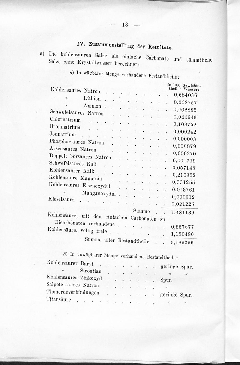 C. Charakter des Grossen Sprudels. / D. Vergleich der im chemischen Laboratorium Fresenius ausgeführten Untersuchungen des Grossen Sprudels.