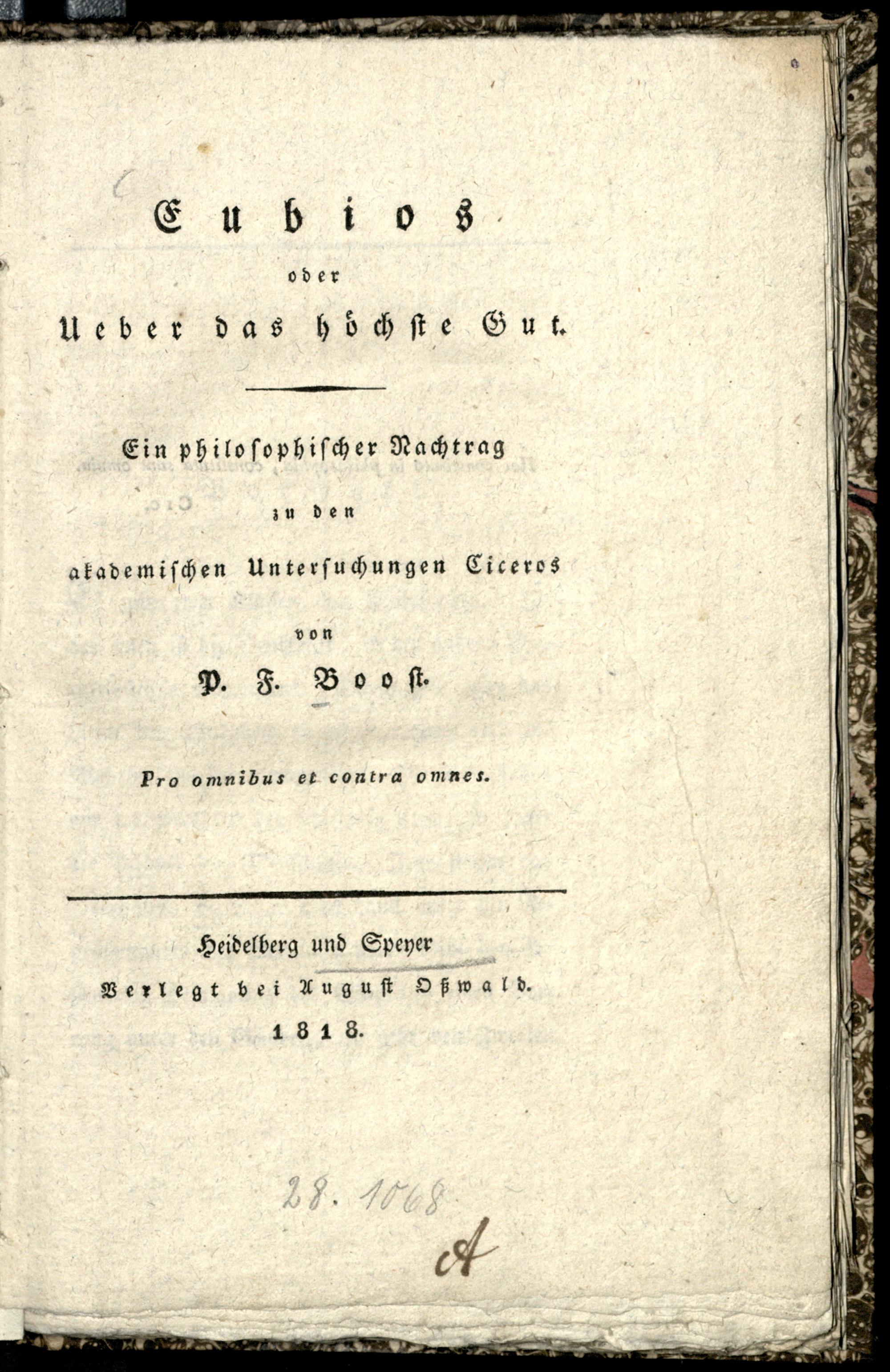 Eubios oder über das höchste Gut : ein philosophischer Nachtrag zu den akademischen Untersuchungen Ciceros / von P. F. Boost