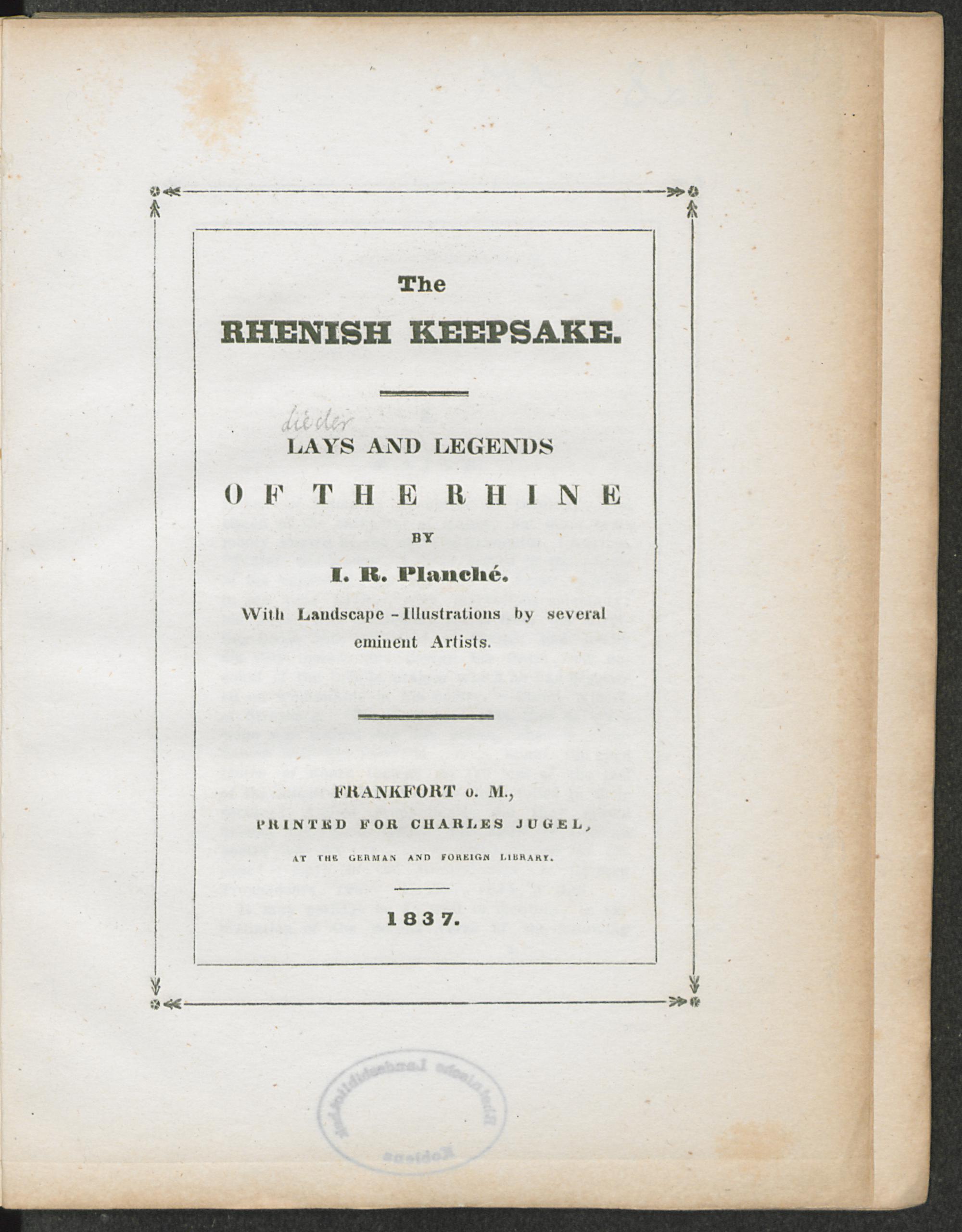 The Rhenish keepsake : lays and legends of the Rhine / by J. R. Planché