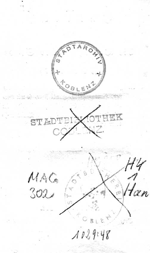 Handbuch für die Bewohner der Stadt Koblenz, die öffentlichen Plätze, Gebäude, Anstalten, Straßen, Hausnummern, Hausbesitzer so wie Verordnungen der öffentlichen Sicherheit, im Markt- und Privatverkehr, und Taxen mehrerer öffentlichen Arbeiten enthaltend