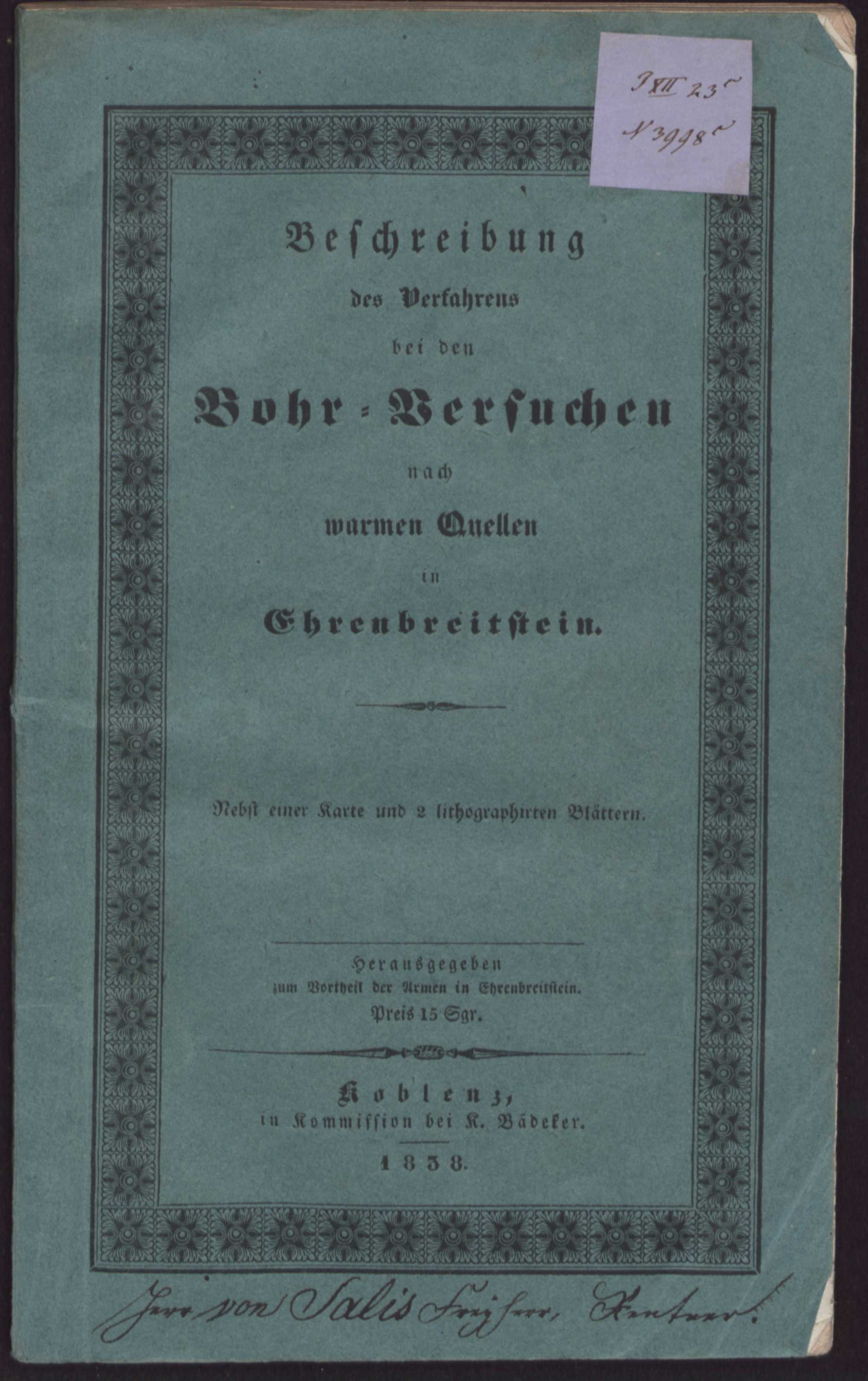 Beschreibung des Verfahrens bei den Bohr-Versuchen nach warmen Quellen in Ehrenbreitstein : nebst einer Karte und 2 lithographirten Blättern
