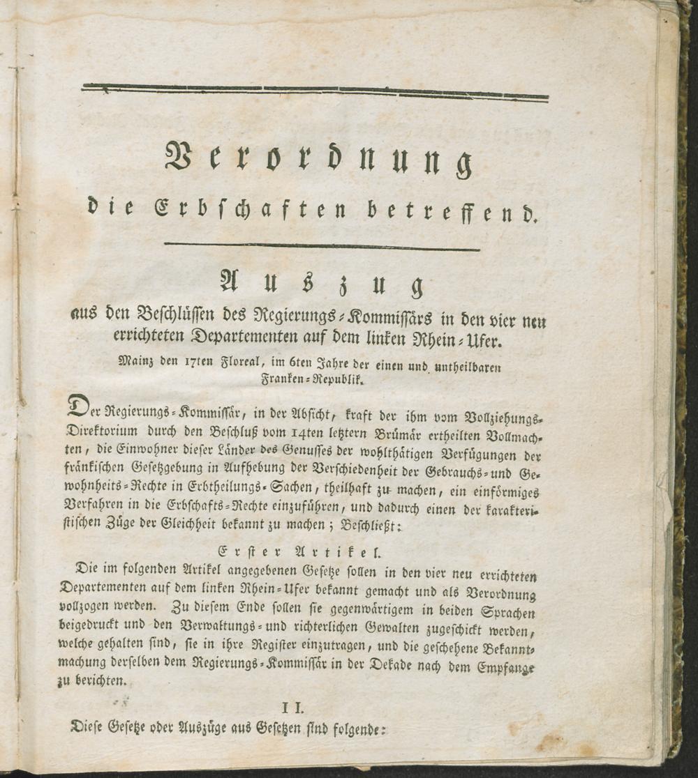 Verw,Forts,3. Auszug aus dem Register der Beschlüsse des Regierungs-Kommissars in den vier neuen Departementen des linken Rhein-Ufers ; Mainz, den 2ten Prärial, 7ten Jahres der untheilbar-vereinten Republik Franken-Republik : Fortsetzung der Verwaltungs-Ordnung