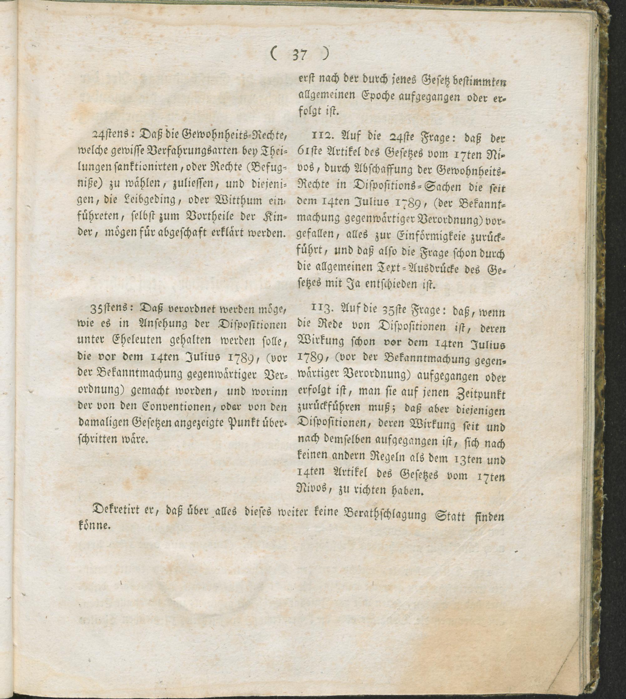 8. Auszug aus dem Register der Beschlüsse des Regierungs-Kommissars in den vier neuen Departementen des linken Rhein-Ufers ; vom 24ten Frimär 7ten Jahrs der fränkischen untheilbar-vereinten Republik : Fortsetzung der Verwaltungs-Ordnung