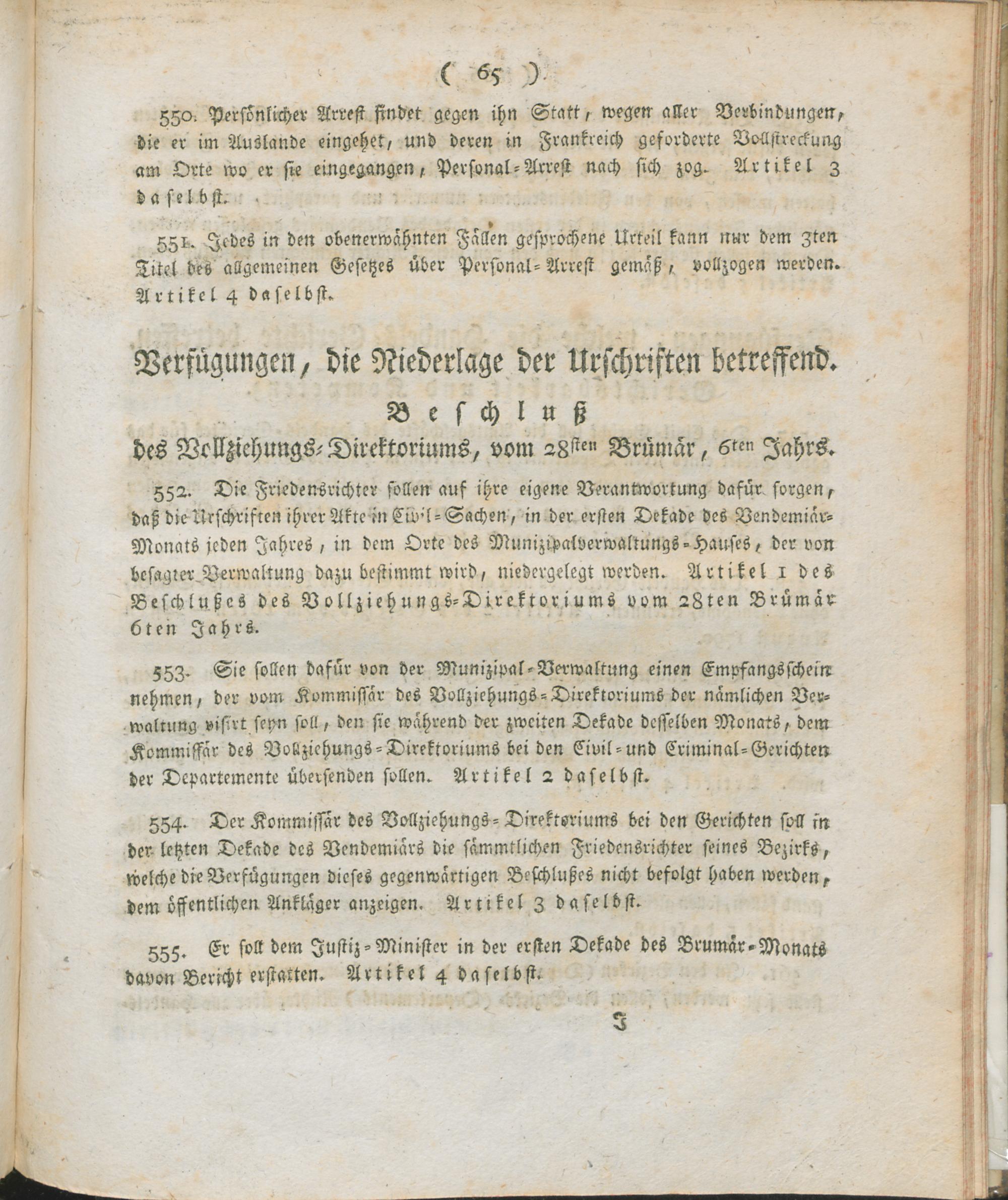 8. Auszug aus dem Register der Beschlüsse des Regierungs-Kommissars in den vier neuen Departementen des linken Rhein-Ufers ; vom 24ten Frimär 7ten Jahrs der fränkischen untheilbar-vereinten Republik : Fortsetzung der Verwaltungs-Ordnung