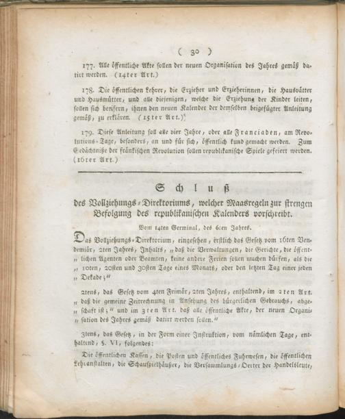 Schluß des Vollziehungs-Direktoriums, welcher Maasregeln zur strengen Befolgung des republikanischen Kalenders vorschreibt.