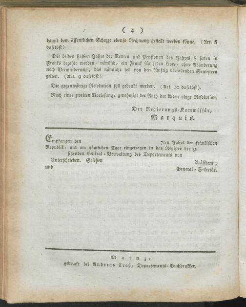 Verw,fern,2 (1799) Fernere Verordnung über das Verwaltungswesen : Auszug aus dem Register der Beschlüsse des Regierungs-Kommissärs in den vier neuen Departementen des linken Rhein-Ufers ; Mainz, den 12ten Prärial 7ten Jahrs der fränkischen unteilbar-vereinten Republik / [Rudler]