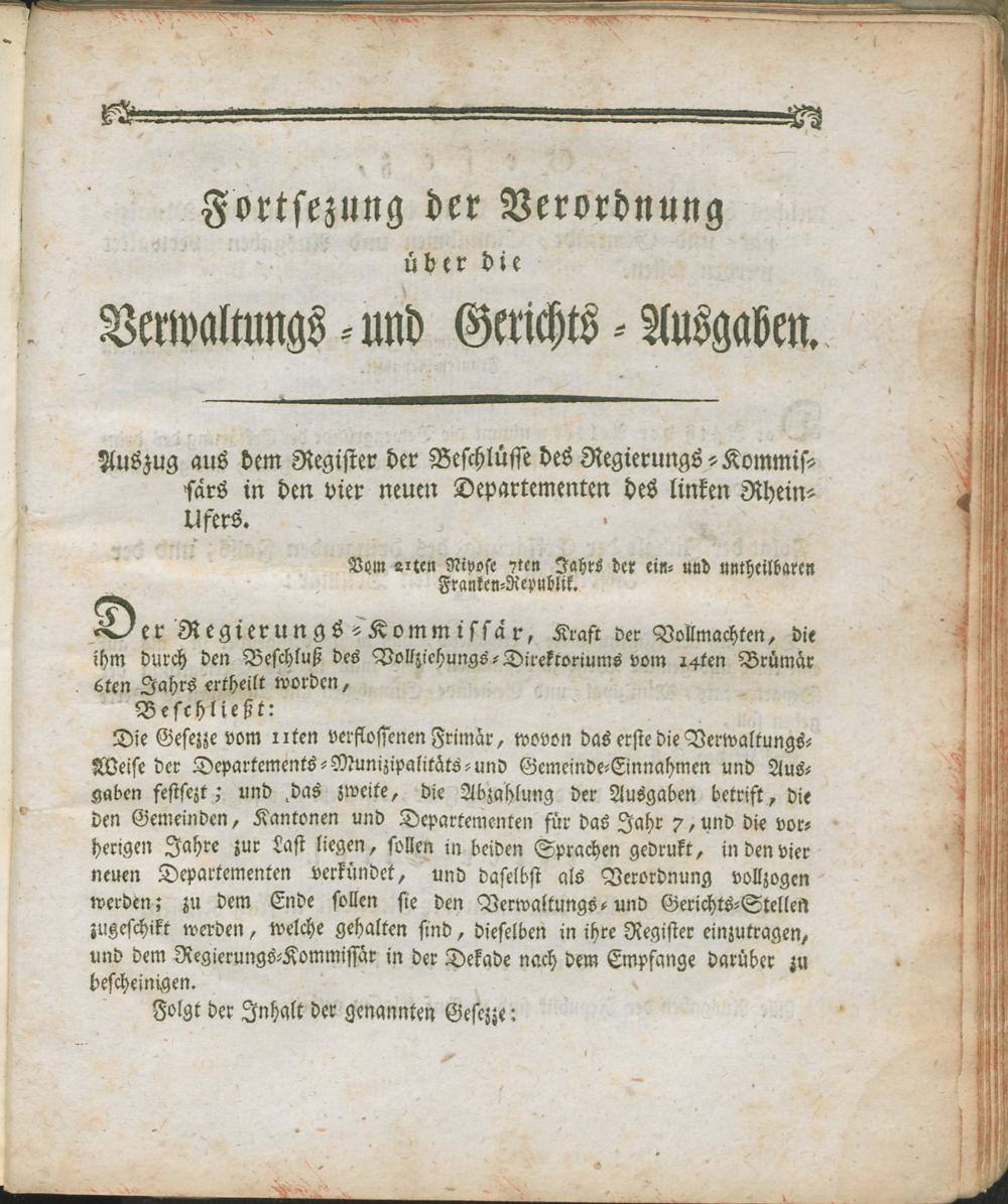 VerwGerAusg,Forts (1799) Fortsetzung der Verordnung über die Verwaltungs- und Gerichts-Ausgaben : Auszug aus dem Register der Beschlüsse des Regierungs-Kommissärs in den vier neuen Departementen des linken Rhein-Ufers ; vom 21ten Rivose 7ten Jahrs der ein- und untheilbaren Franken-Republik / [Rudler]